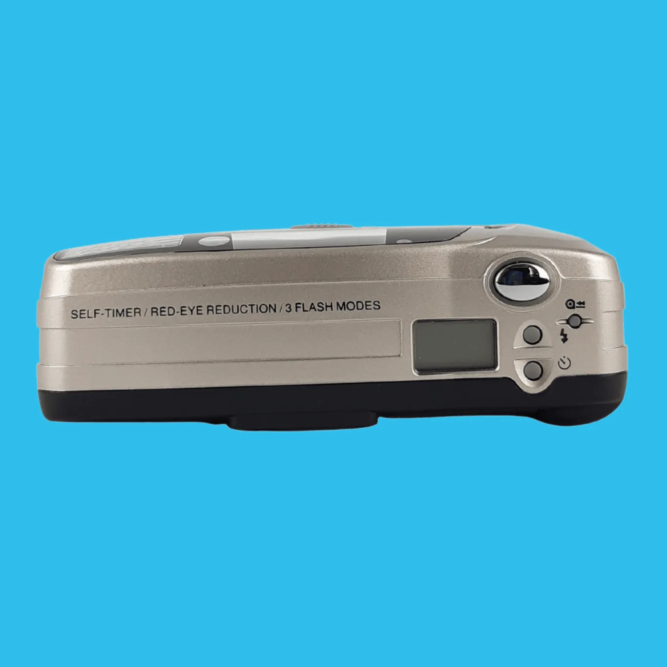 The Minolta AF50 Big Finder is a point-and-shoot camera for 35mm film, made by Minolta in 1997. It is one of many point-and-shoot cameras of that time which boast of a big viewfinder, perhaps easy to use while wearing spectacles. It is one of the better-specified of the type, having auto-focus, down to one metre, rather than fixed focus. In fact it has focus lock (where the user focuses on one subject with a half-press of the shutter release, then reframes while holding the button). Like all the ‘big finder’ cameras, it has a built-in flash.