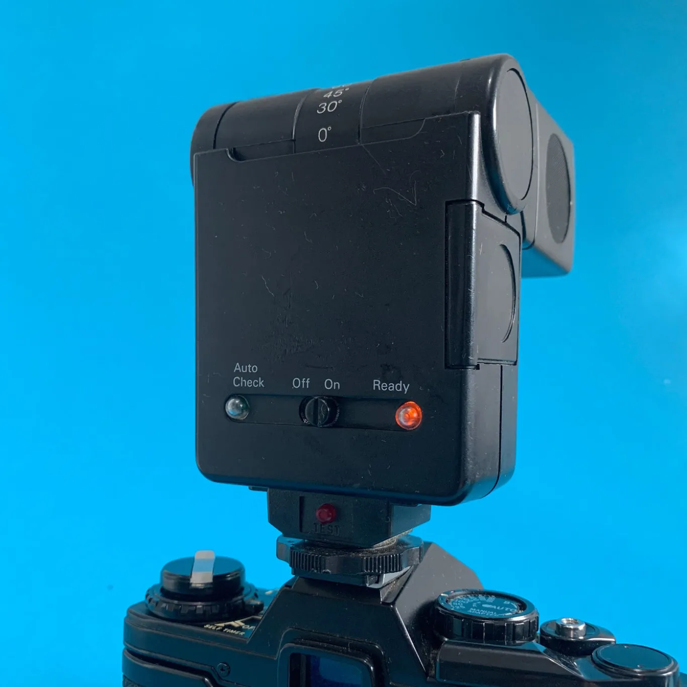 This external flash unit will work on any 35mm film camera that has a hot shoe attachment. It is worth checking your user manual on how to use the flash, but the standard way is to pop it on the hot shoe attachment, wait for it to charge (you’ll hear a little whine whilst its powering up), set your camera to flash mode and when you shoot, the flash flashes! Excellent used condition.