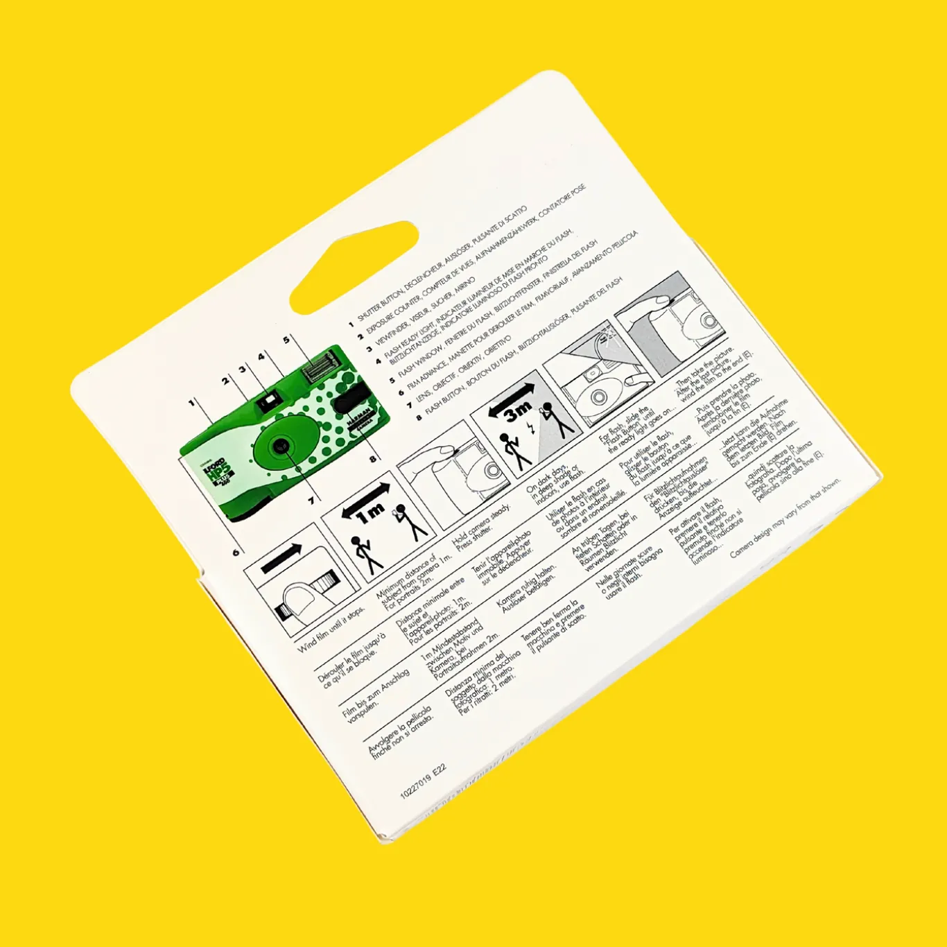 400 – 27 Exposure Single Use disposable camera features a 30 mm, f/10 lens, with a shutter speed of 1/125.