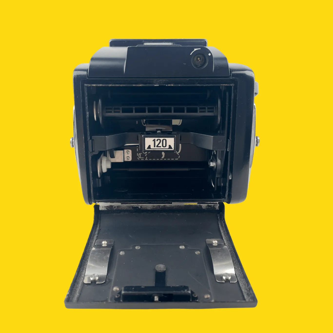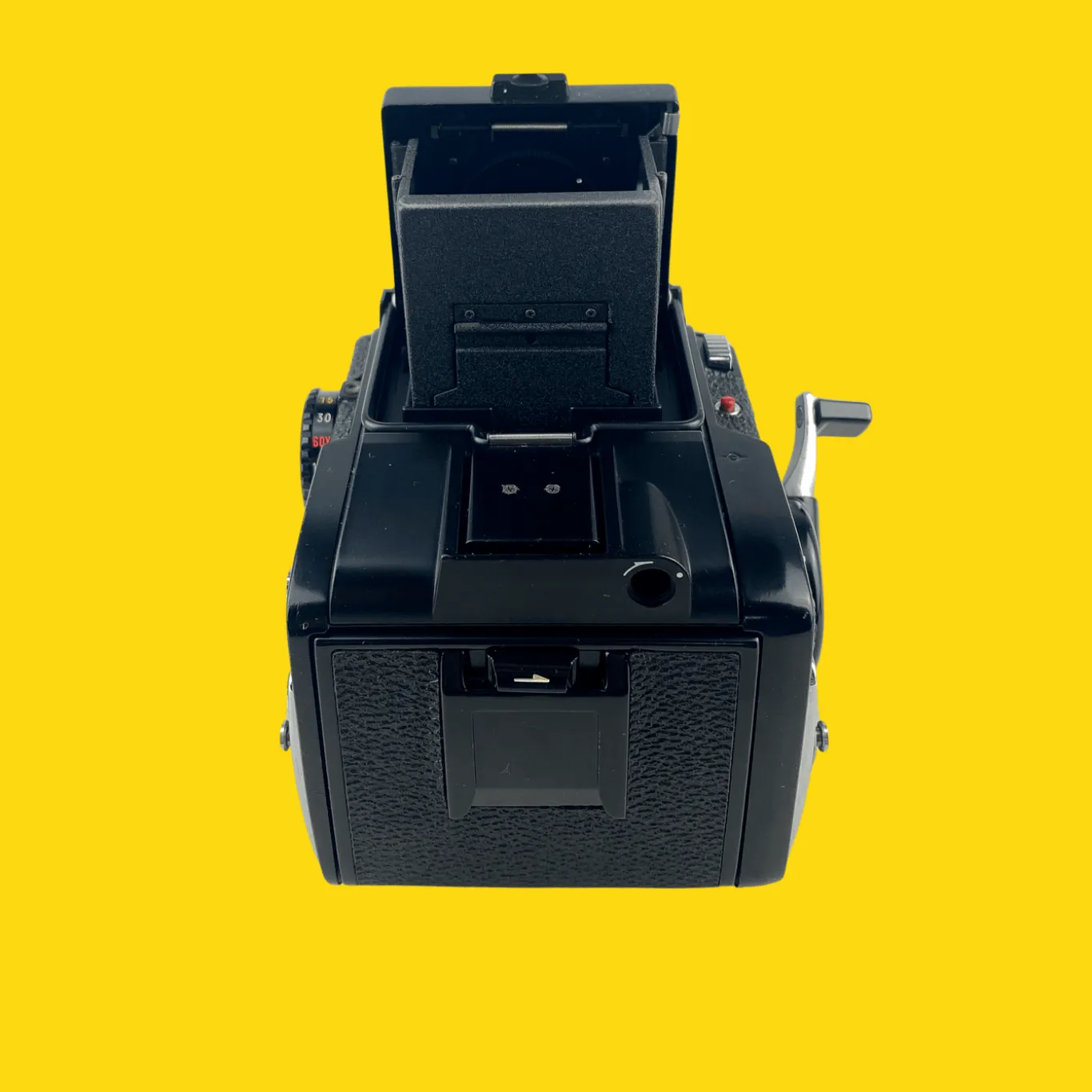 The M645 1000s features 15 6×4.5 exposures, on a standard roll of 120 film. The Camera features a modular design, allowing interchangeable viewfinders and lenses. It uses an electronically controlled cloth focal plane shutter offering speeds from Bulb to 8 seconds and 1/1000 seconds.