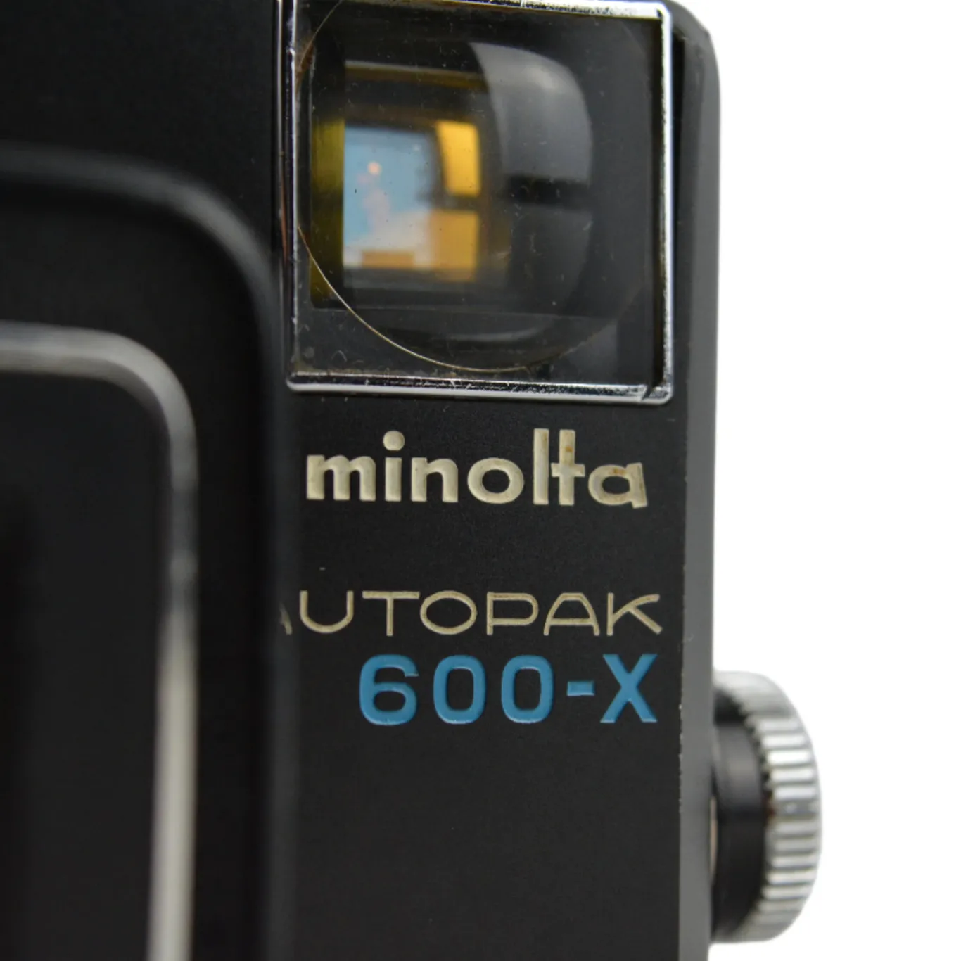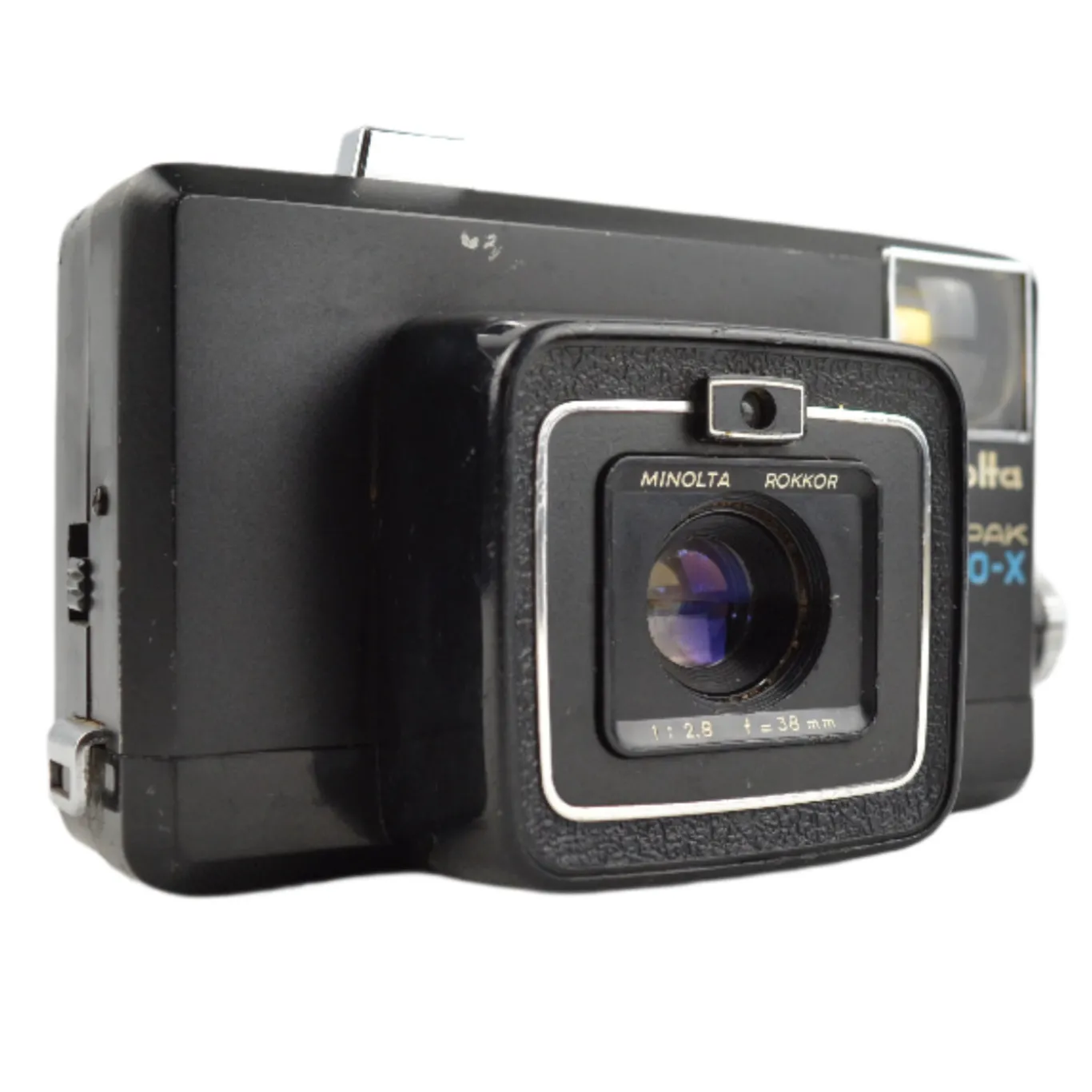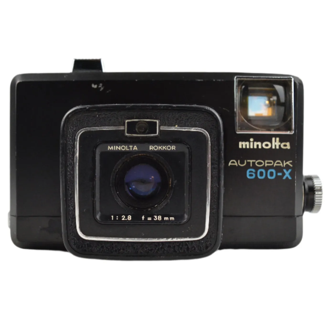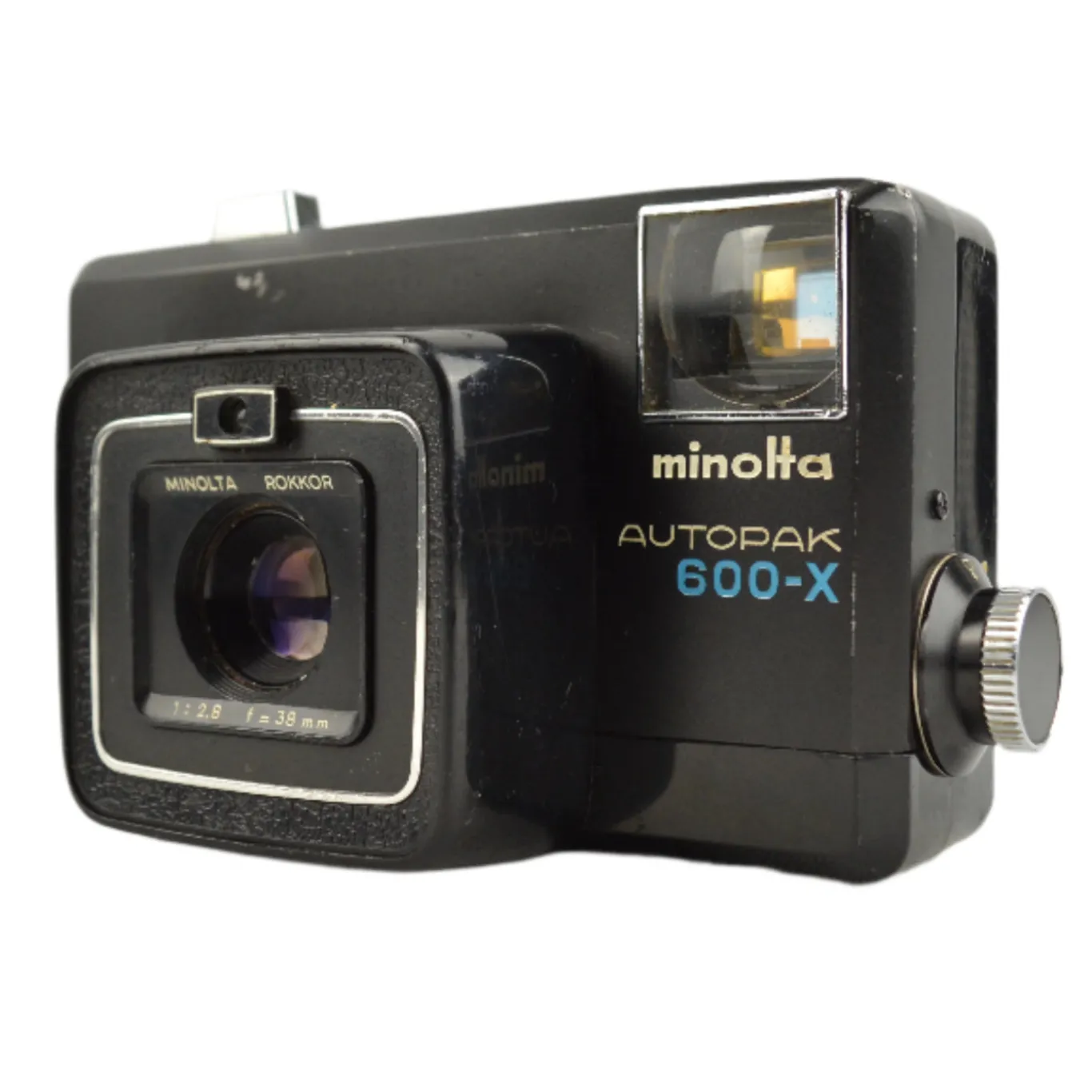 The Minolta Autopak 600‑X is a 126-format viewfinder camera introduced in 1971 in Japan. It features a fixed-focus 38 mm f/2.8 Rokkor lens and automatic exposure with two shutter speeds (approximately 1/45 and 1/90 second). Focus is set via a zone-style system, while aperture is controlled by a light meter spanning f/2.8 to f/22. Designed to accept Magicube flash units, its exposure system fires the cube automatically when needed.
