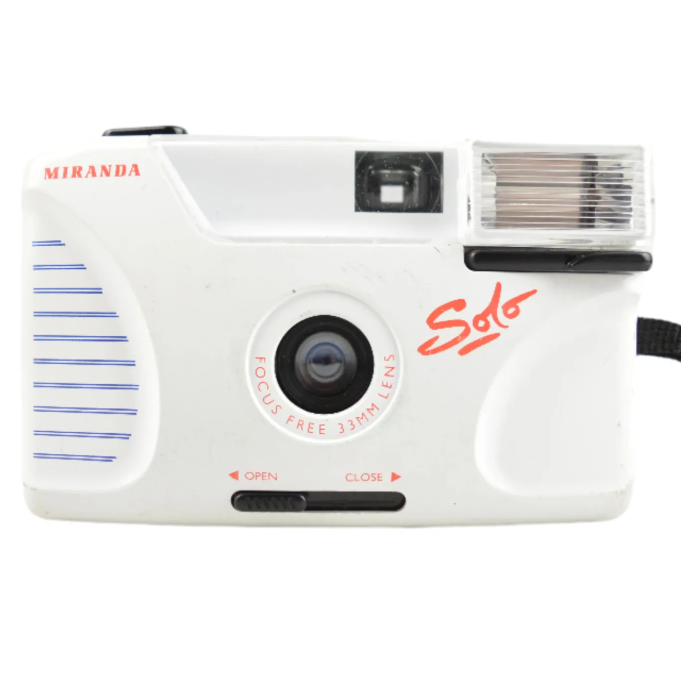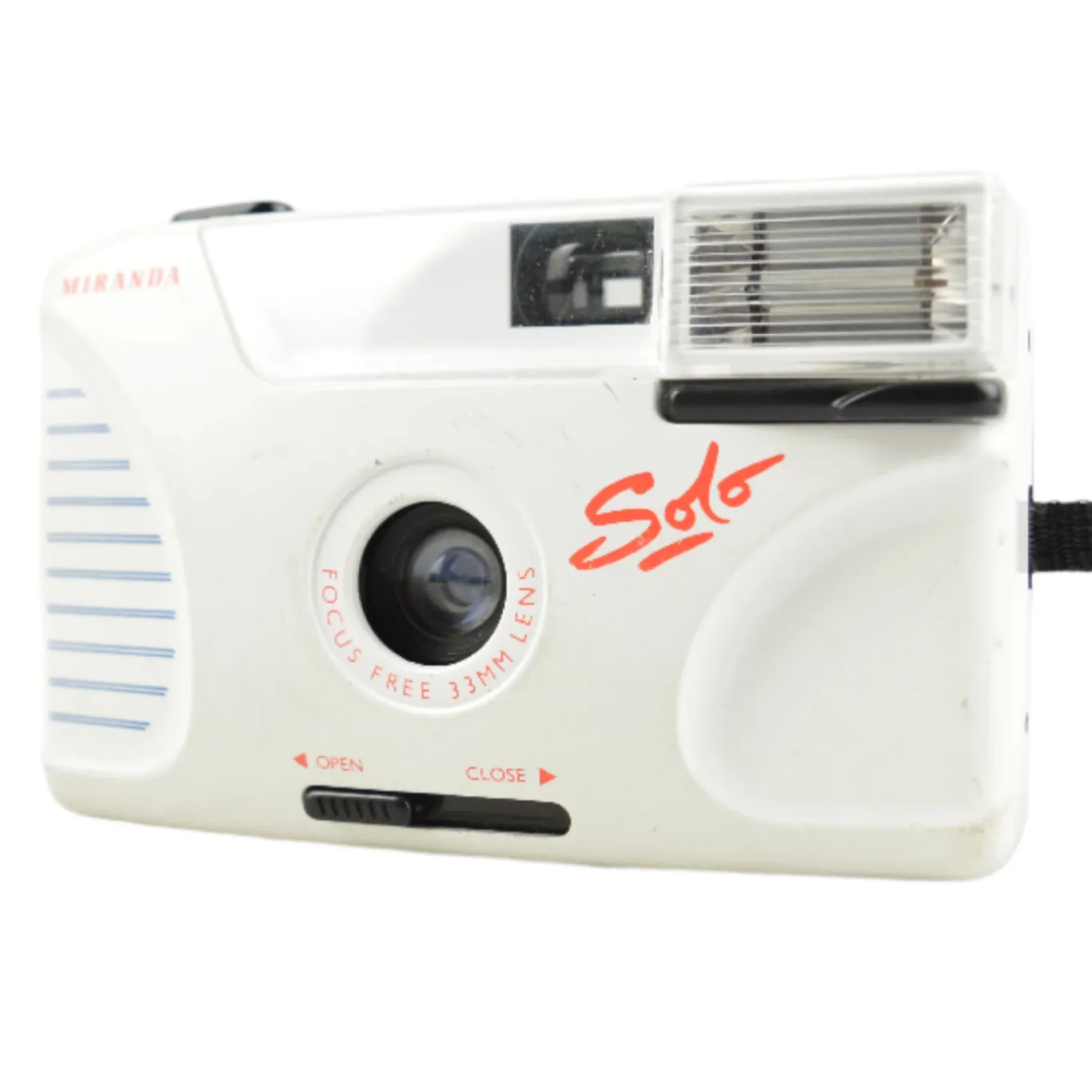 The Miranda Solo is a compact 35mm point and shoot film camera featuring a fixed focus 33mm f5.6 lens. Designed for simplicity, it uses a fixed shutter speed around 1/100 second and offers automatic exposure control, making it effortless to point and shoot in daylight. The camera advances and rewinds film manually and requires no batteries unless using an external flash.
