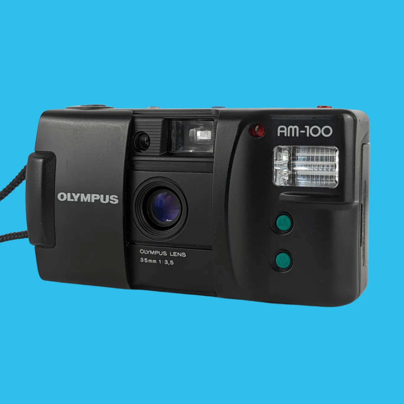 The Olympus AM-100 (Infinity S in the US) of 1987 is a fully automatic compact camera that used a 3-point zone focus to keep the price lower than autofocus rivals. Buttons on the front alter the focus distance from the fixed medium to a close-up (0.5-1m) or infinity. This camera was known as the “Picasso Petit” in Japan.