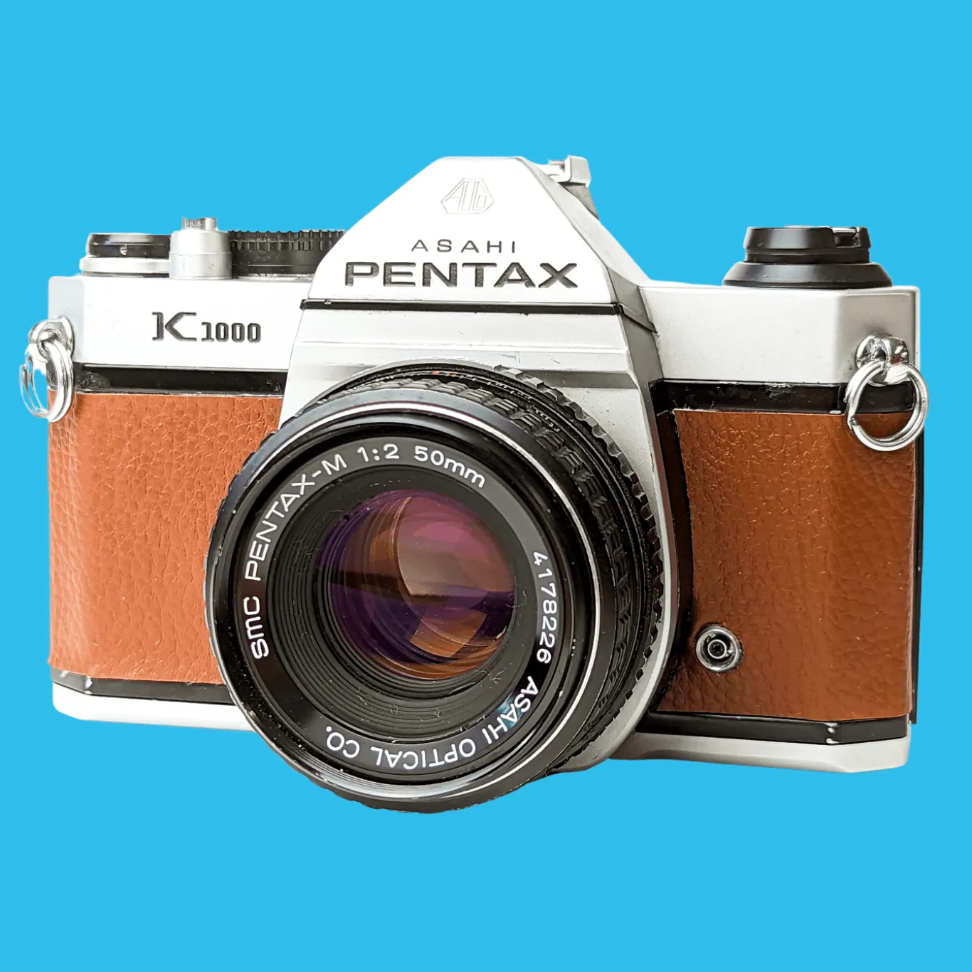 Pentax K1000 Brown Leather Vintage SLR 35mm Film Camera with Pentax f/2 50mm Prime Lens.