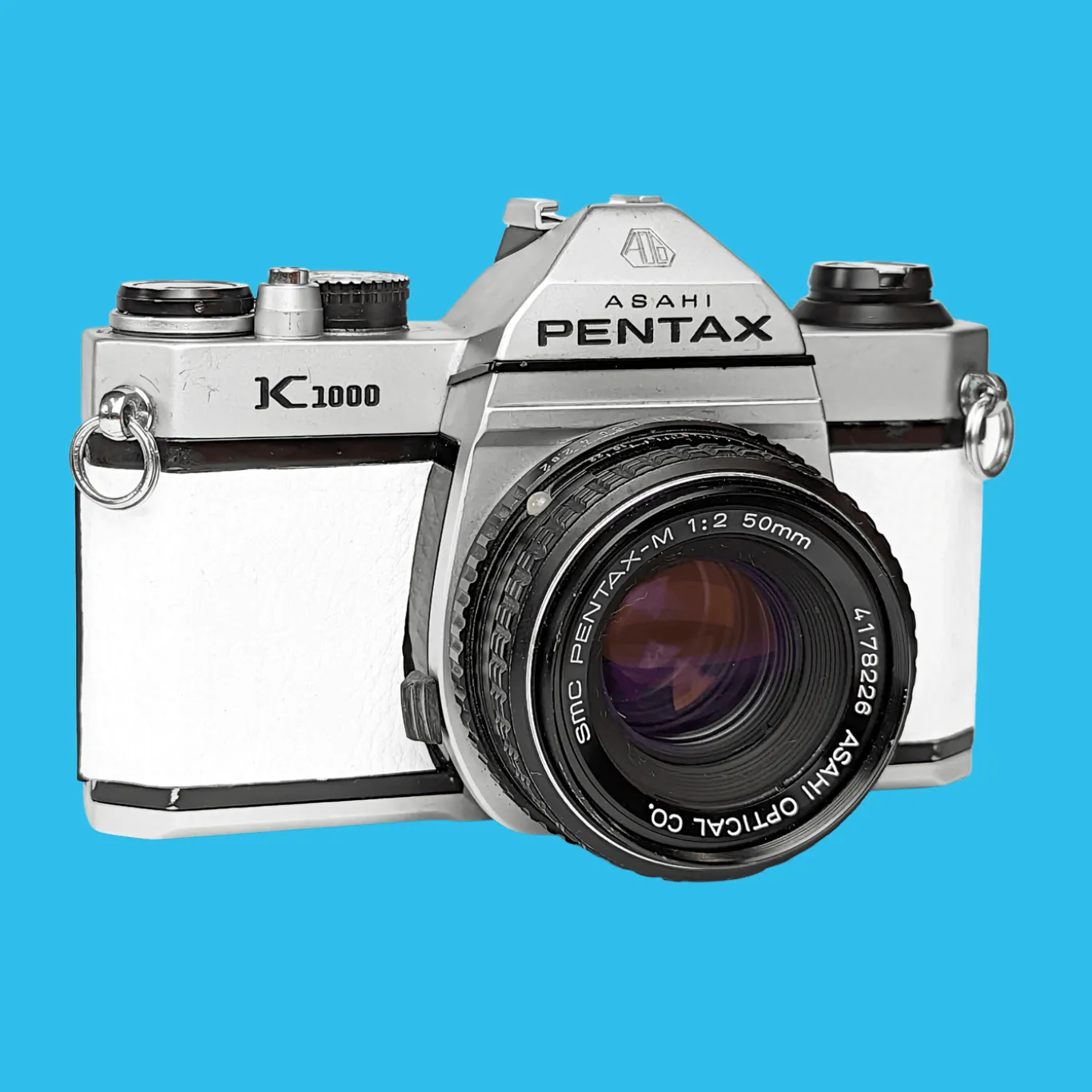 Pentax K1000 White Leather Vintage SLR 35mm Film Camera with Pentax f/2 50mm Prime Lens