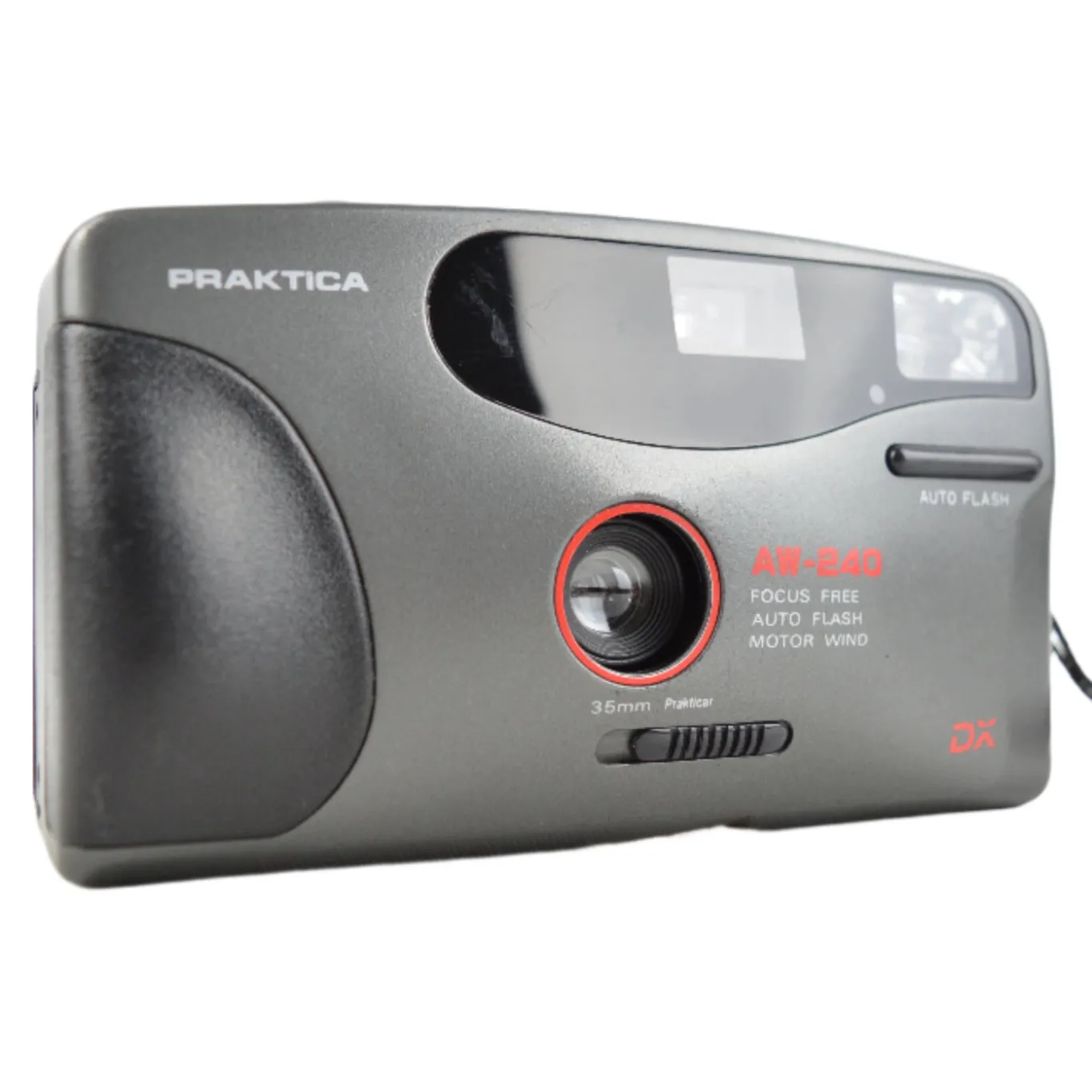 The Praktica AW 240 is a lightweight 35mm film point and shoot camera featuring a fixed focus 35mm Prakticar lens. With automatic exposure and motorized film advance and rewind, it simplifies the process so you can just point and shoot. A built-in flash activates automatically in low light, and it performs best with ISO 100 or 200 film. Weighing around 175 grams and easy to carry, it offers reliable analog performance for everyday use. Ideal for beginners or casual photographers looking for simple and enjoyable film shooting.