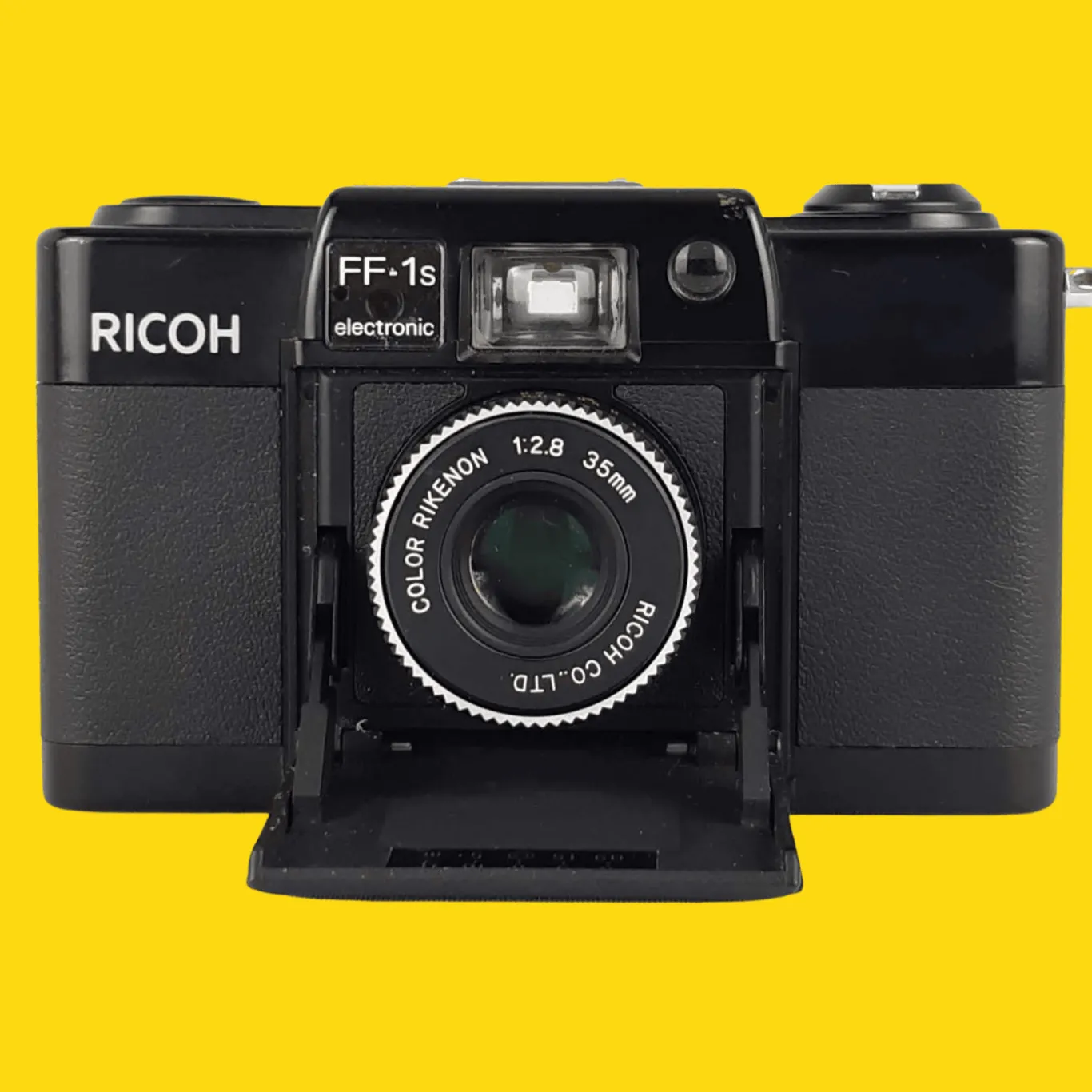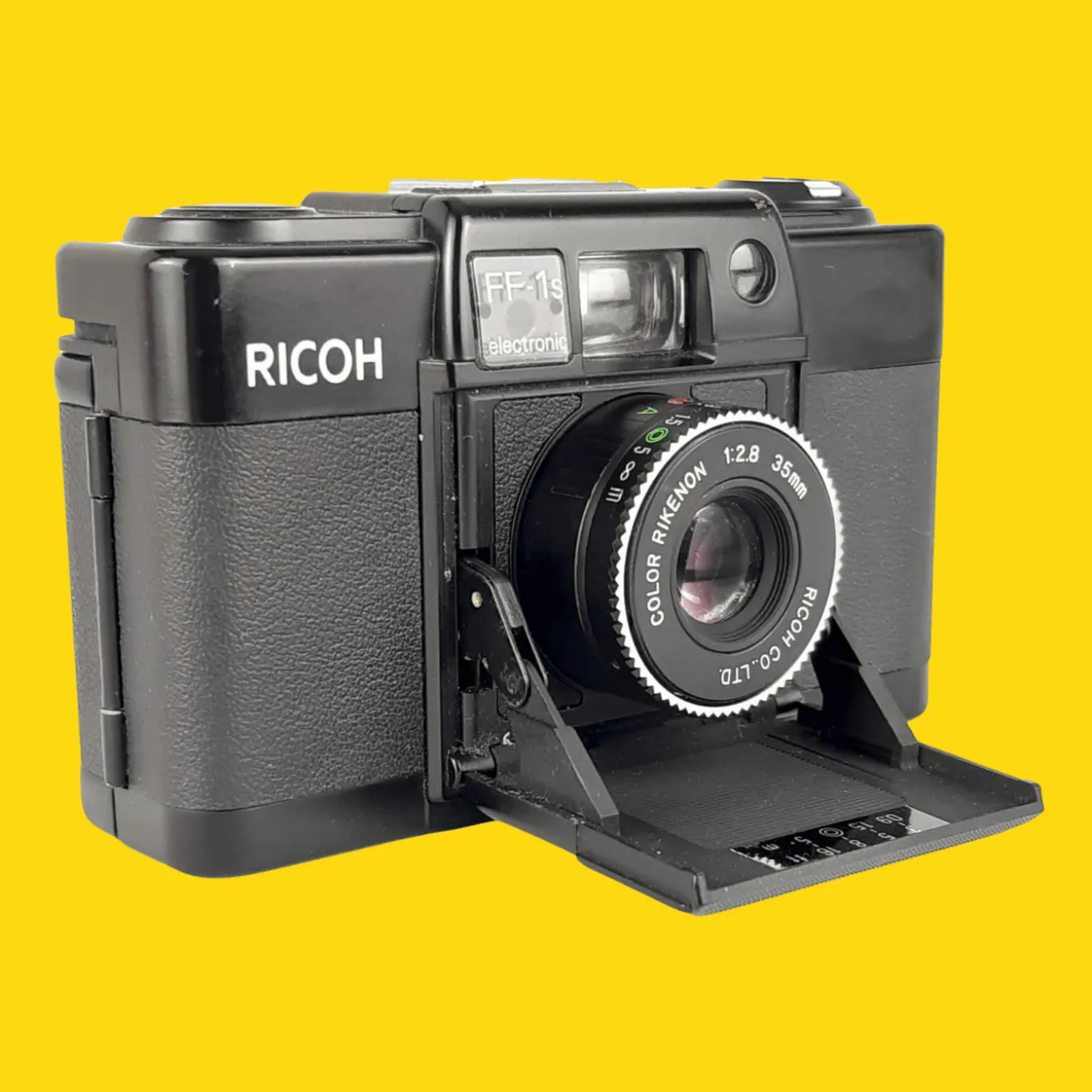 The Ricoh FF-1s is a scale-focusing, programmed exposure camera made by Ricoh in the late 1970’s. It features a folding lens cover similar to the Minox 35 series cameras.