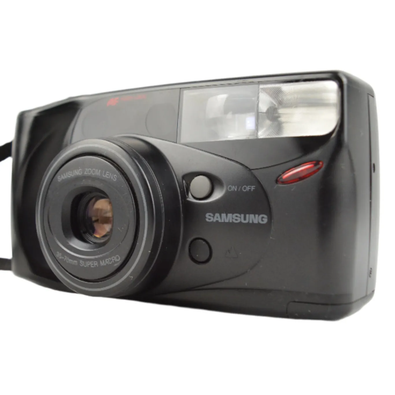 The Samsung AF Zoom 777i is a versatile 35mm film point and shoot camera featuring a zoom lens covering 35 to 70mm focal lengths. It offers autofocus and automatic exposure for hassle free shooting in varied conditions. A built in flash fires automatically in low light and film advance and rewind are motorised for effortless operation. Powered by AA batteries the camera remains lightweight and easy to carry. With its zoom capability and simple controls the AF Zoom 777i delivers flexible performance for everyday snapshots and travel photography.