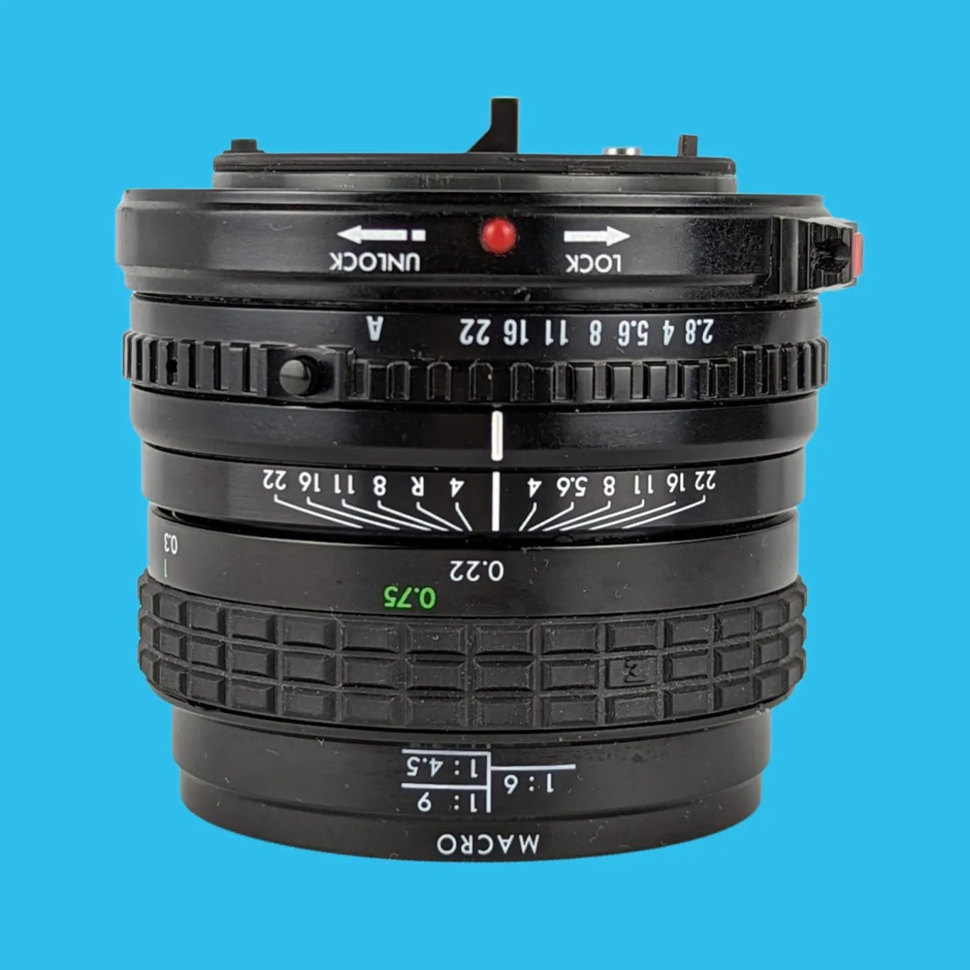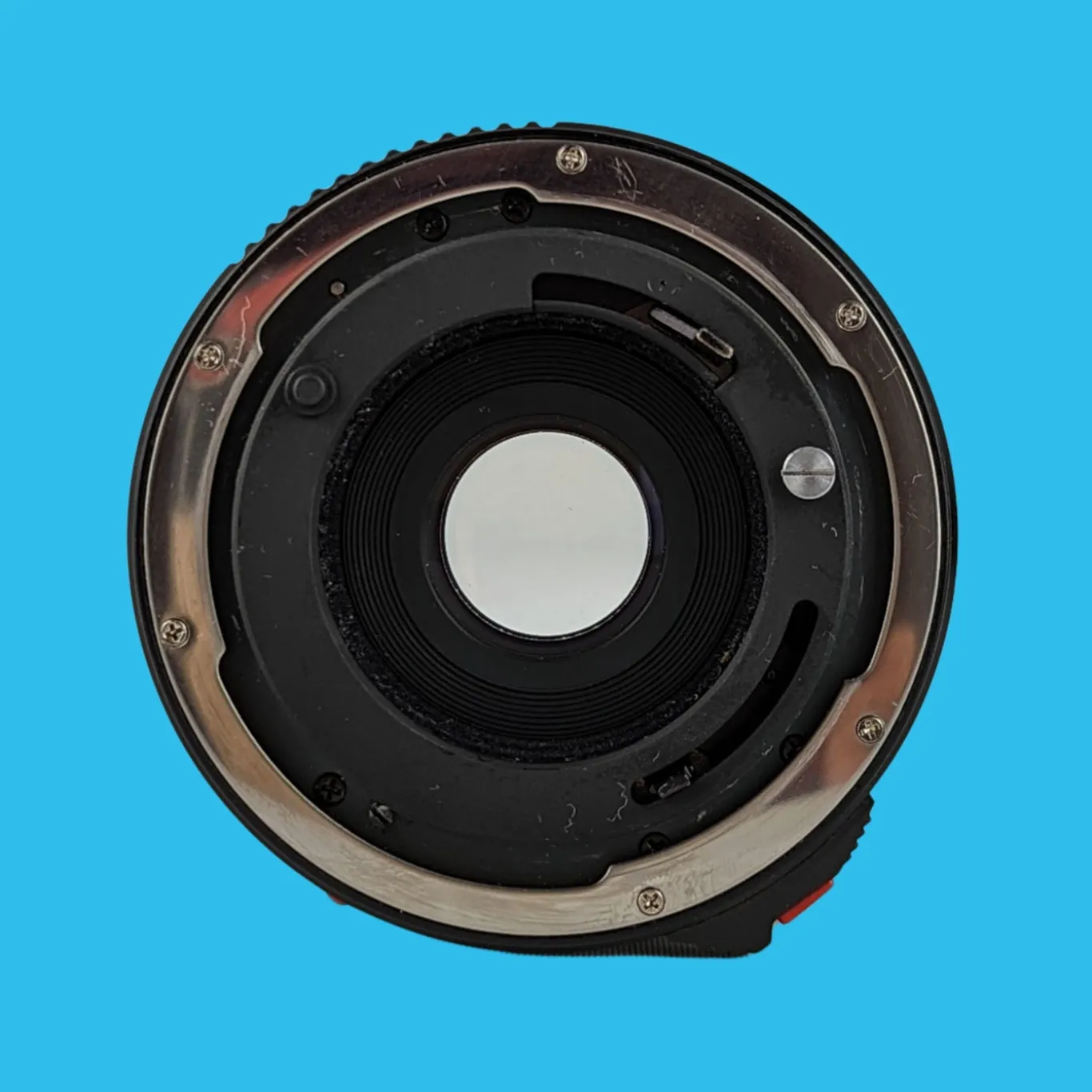 The lens elements are clear with just a few minor dust specs (no haze or fungus). The focusing operation works smoothly, plus all the apertures are selectable. This lens will fit on a Canon with a FD mount. This FD mount is classed as a ‘Breech lock’ meaning you rotate the bottom ring while the lens stays still to lock the lens to the camera body.