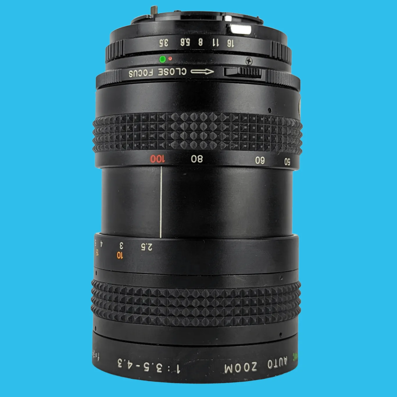 The lens elements are clear with just a few minor dust specs (no haze or fungus). The focusing operation works smoothly, plus all the apertures are selectable. This lens will fit on an Olympus with an OM mount