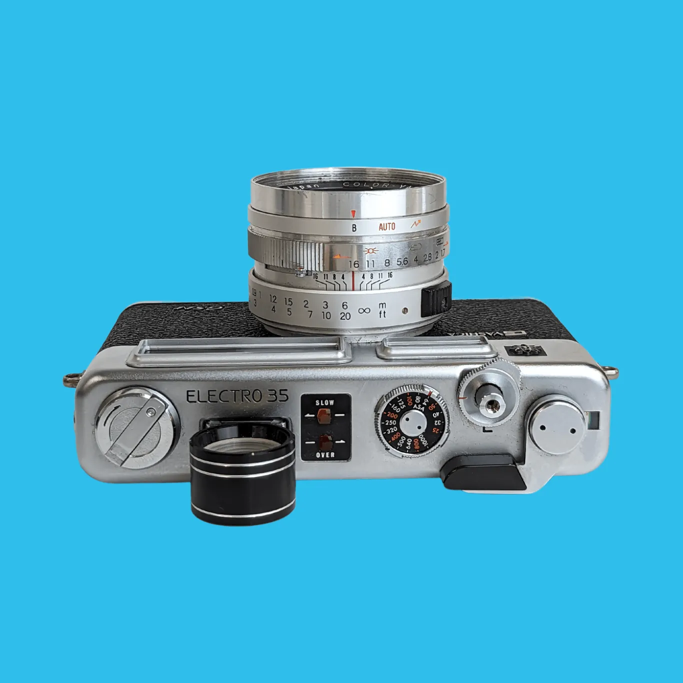 The Yashica Electro GSN features an electronic shutter with speeds ranging from 1/500 sec to 1/30 sec, a bulb mode, a built-in self-timer, and X for flash sync. Rangefinder focusing with a bright frame that features automatic parallax compensation from 0.8m to infinite. Automatic electronic shutter controls (aperture priority mode) measured by the built-in CDS censor. ASA range of 25 to 1000.