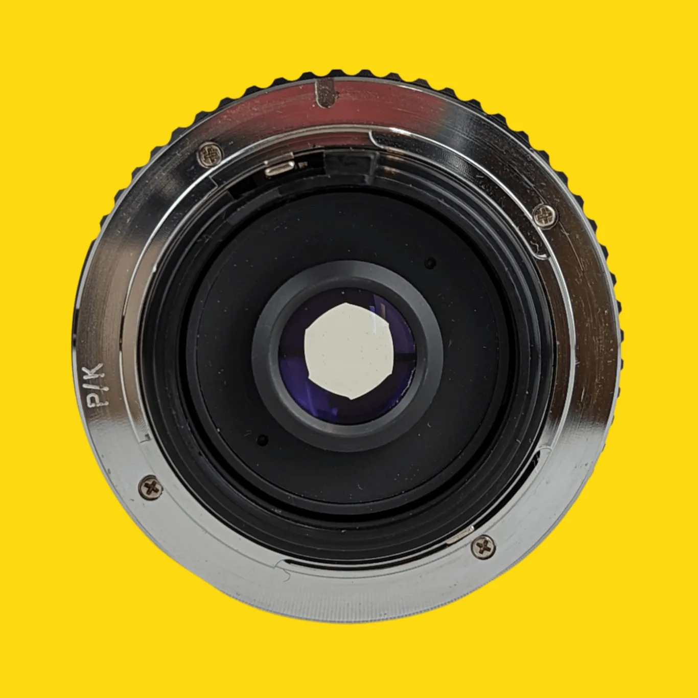 The lens elements are clear with just a few minor dust specs (no haze or fungus). The focusing operation works smoothly, plus all the apertures are selectable. This lens will fit on an Pentax SLR with a PK mount