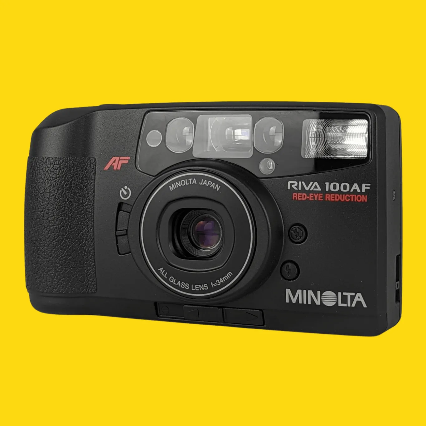 The Minolta Riva 100 AF is a cheap autofocus compact camera released in 1996. While a basic model, it is not as limited as the Riva AF cameras of the early 90s. It has both automatic flash, forced flash and a flash cancel button. Its only additional feature is a pre-flash function to prevent red eyes.