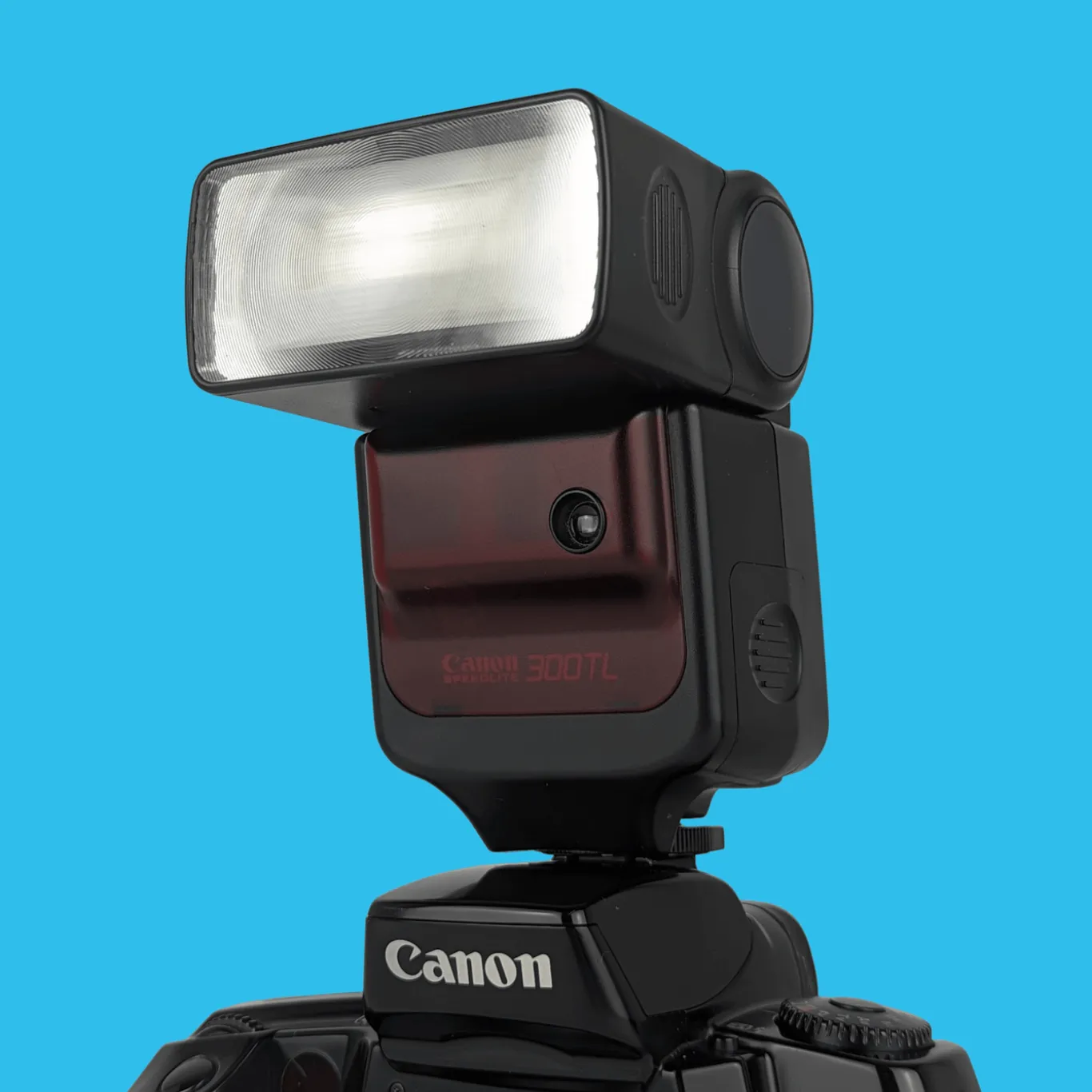 This Canon 300TL external flash unit will work on any 35mm film camera that has a hot shoe attachment. It is worth checking your user manual on how to use the flash, but the standard way is to pop it on the hot shoe attachment, wait for it to charge (you’ll hear a little whine whilst its powering up), set your camera to flash mode and when you shoot, the flash flashes!