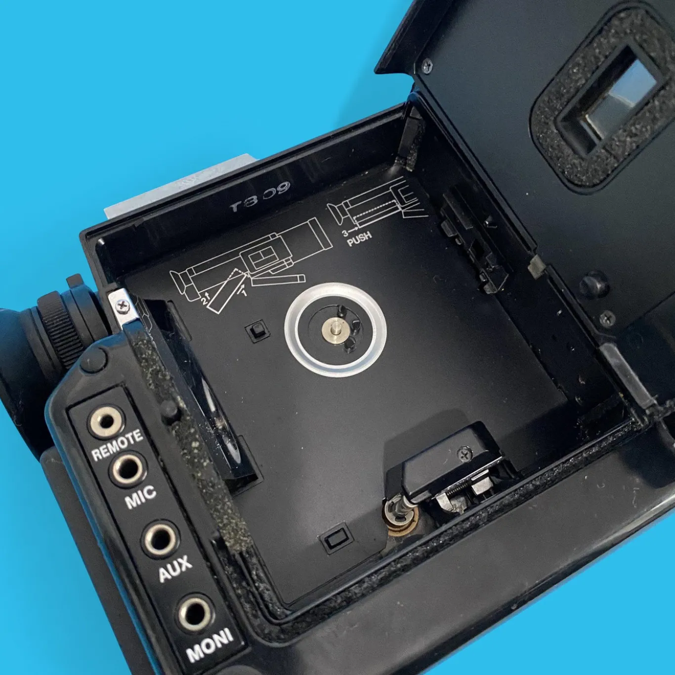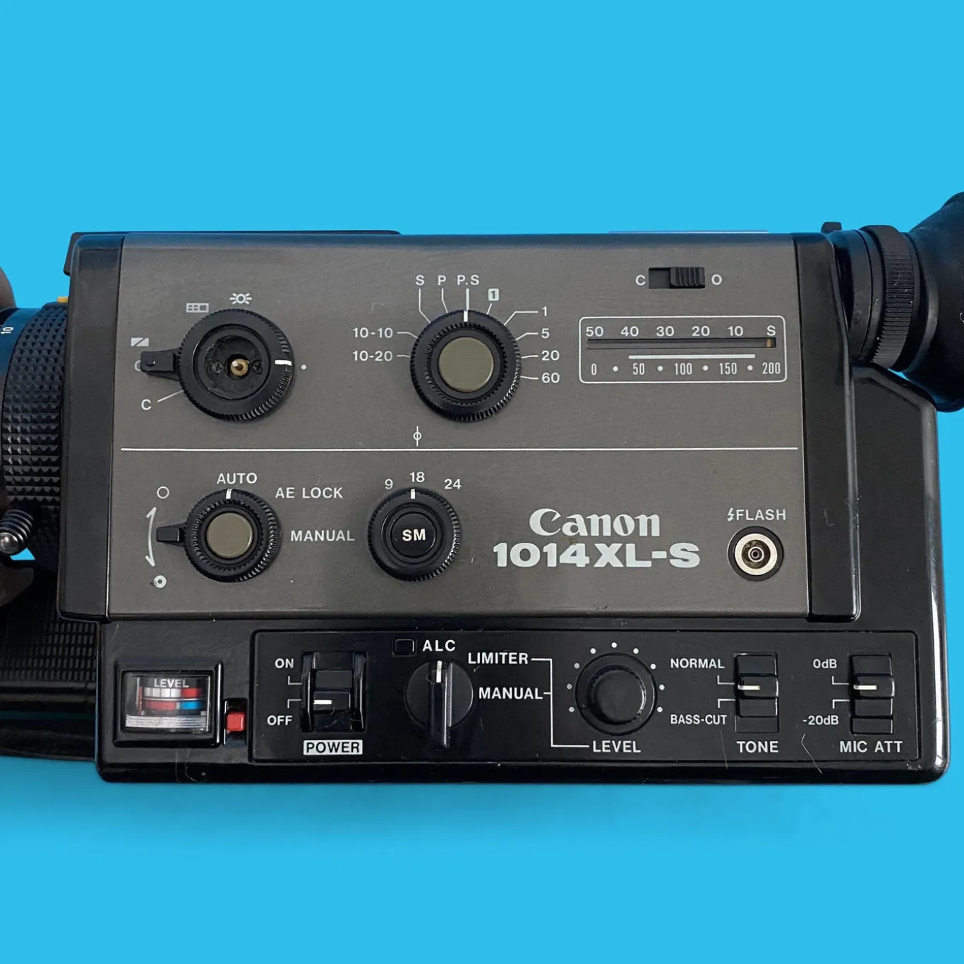 - Viewfinder information: aperture scale, over/under exposure warnings, film end precaution/film end display (END mark)/film jam in the cartridge/battery power too low, manual aperture control (LED), sound recording level (LED) and footage indication needle