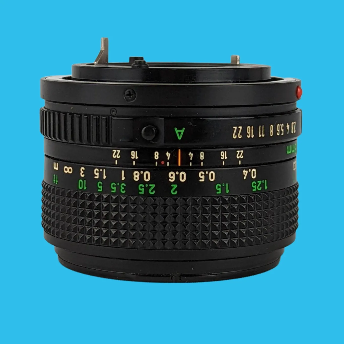 The lens elements are clear with just a few minor dust specs (no haze or fungus). The focusing operation works smoothly, plus all the apertures are selectable. This lens will fit on a Canon with a FD mount