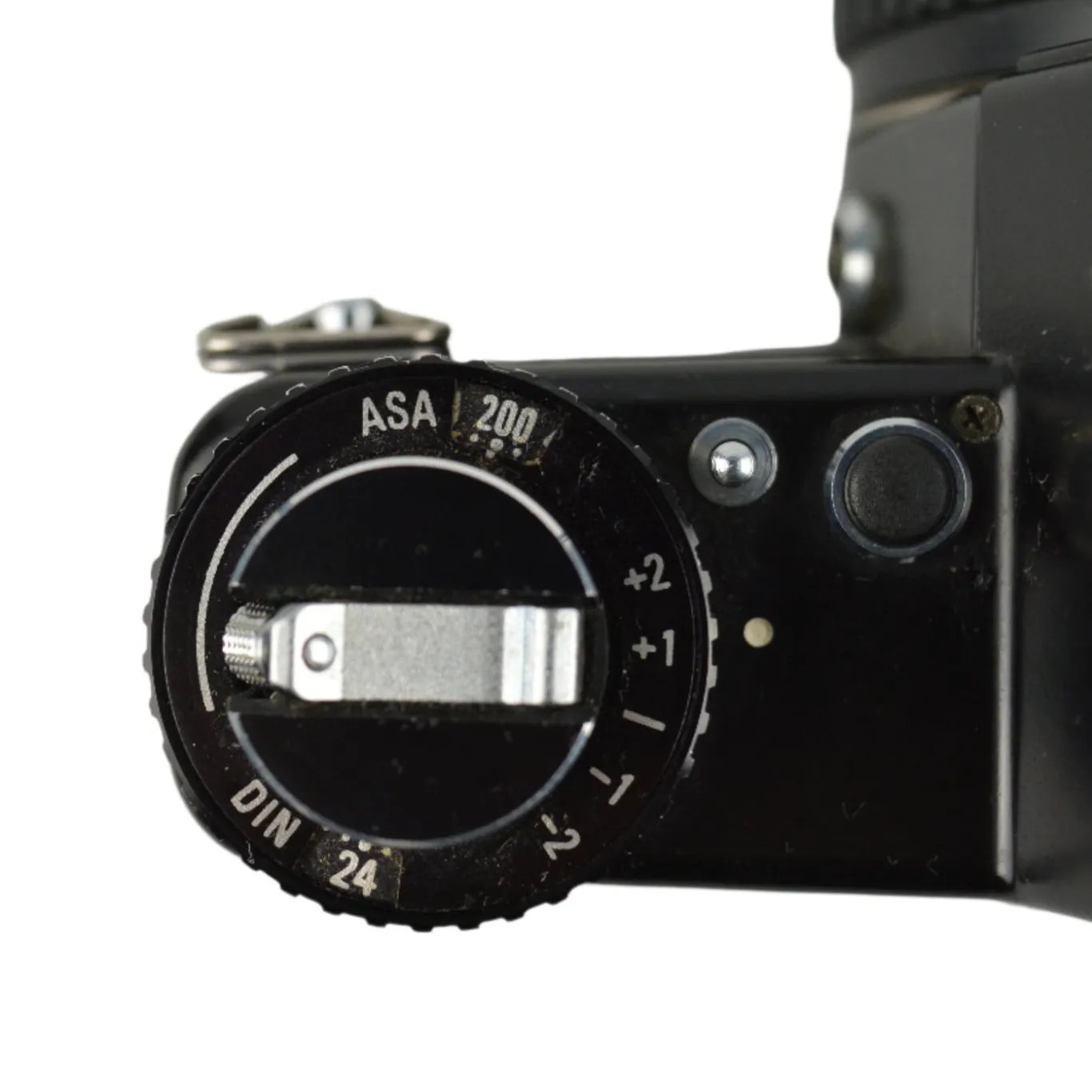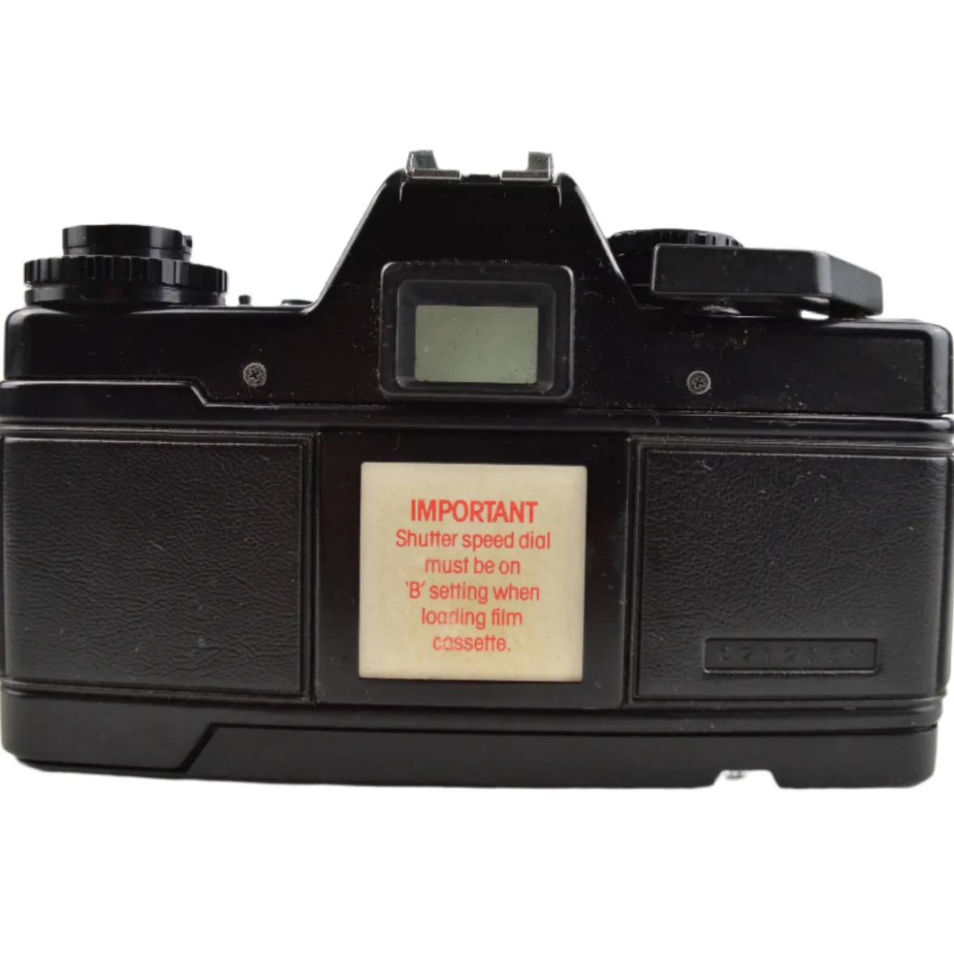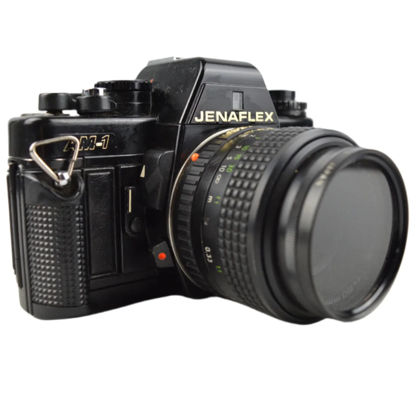 The Jenaflex AM‑1 is a robust 35 mm SLR made in East Germany between 1985 and 1987. It belongs to the Praktica BC‑1 series with B-mount use and electronic diaphragm control for TTL metering. Combined with the Pentacon Praktica 50 mm f/1.8 prime lens—often rebranded Carl Zeiss Jena glass—it delivers sharp images with fast aperture performance. Exposure times range from 40 seconds to 1/1000 second, with manual precision settings available. Its build includes a pentaprism viewfinder with LED shutter indicators, motor winder support, and a mechanical self‑timer.