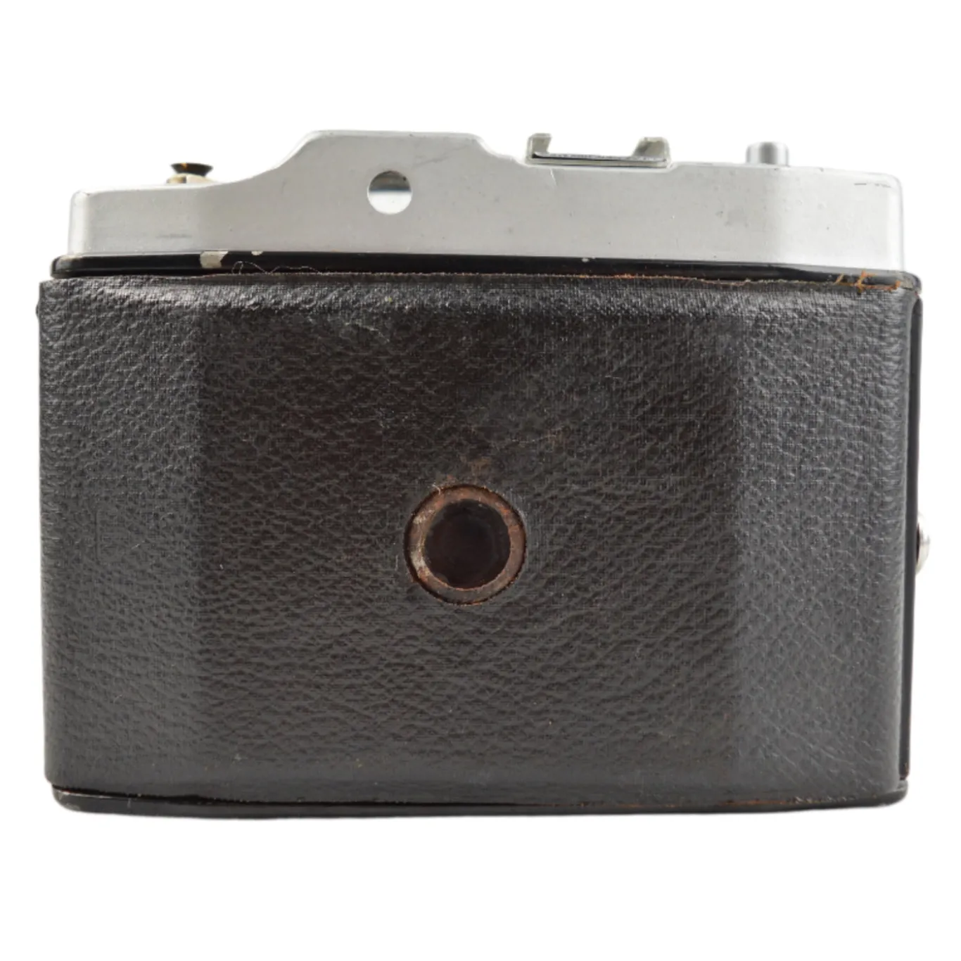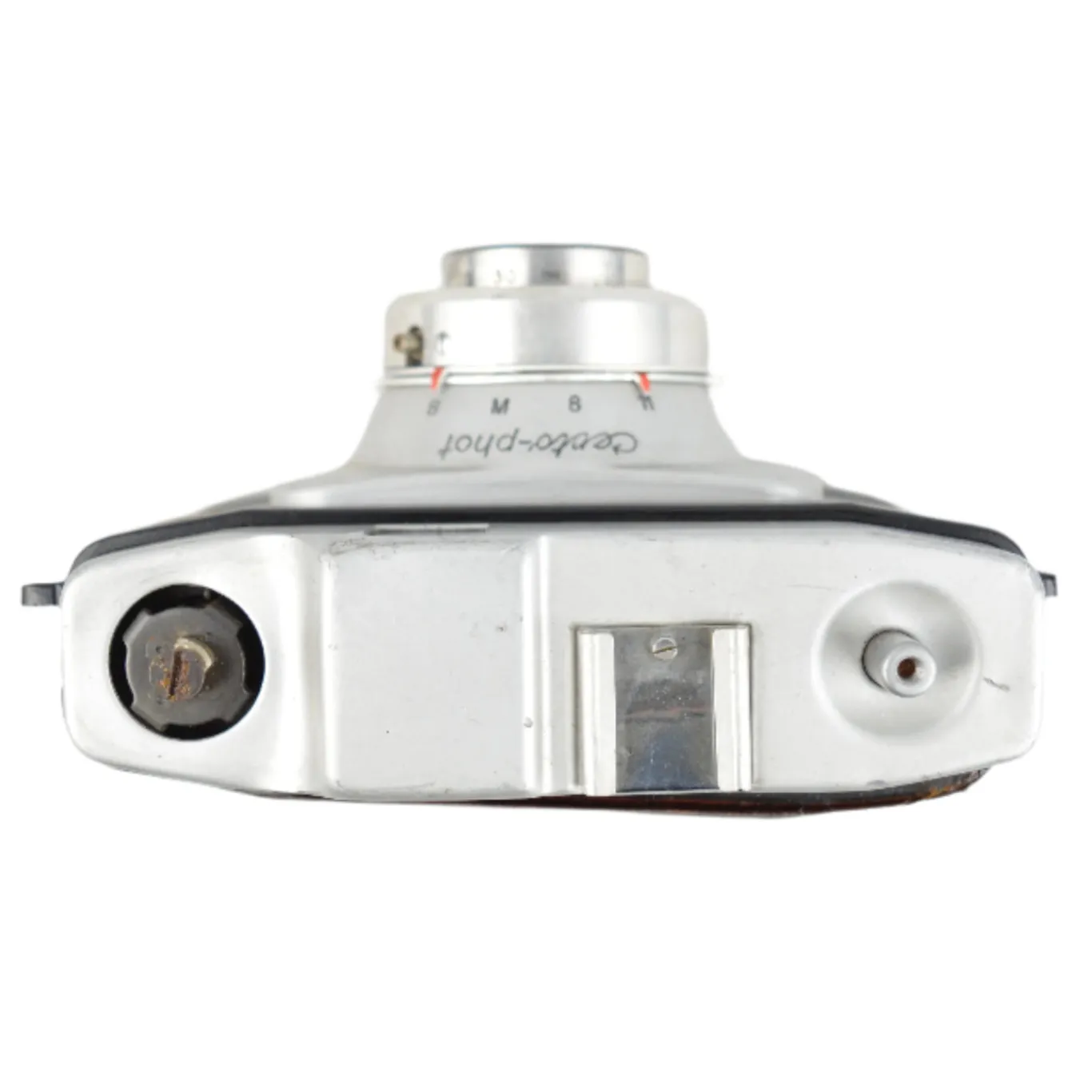The Certo‑Phot is a vintage medium-format viewfinder camera introduced in East Germany around 1958. It uses 120 roll film to produce twelve 6×6 cm square images. Its simple meniscus achromat lens is fixed-focus with two aperture settings (f/8 and f/11) and a single shutter speed at approximately 1/50 s plus bulb mode. Zone focusing is done via a ring on the lens, ideal for distance guesswork. The all-metal body features classic styling, a reverse-telescopic viewfinder, film advance knob, red film window, tripod mount, cable-release socket, and flash sync