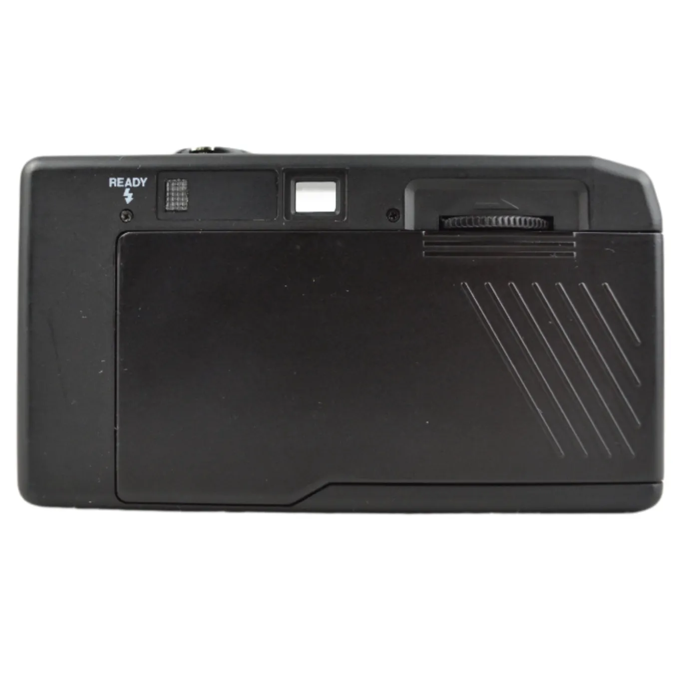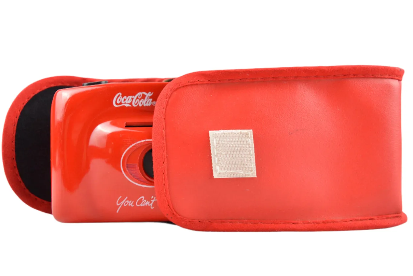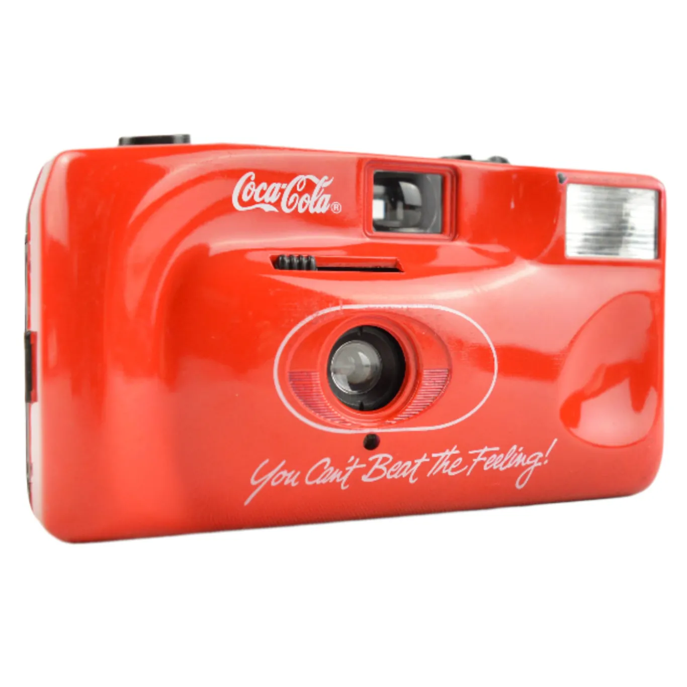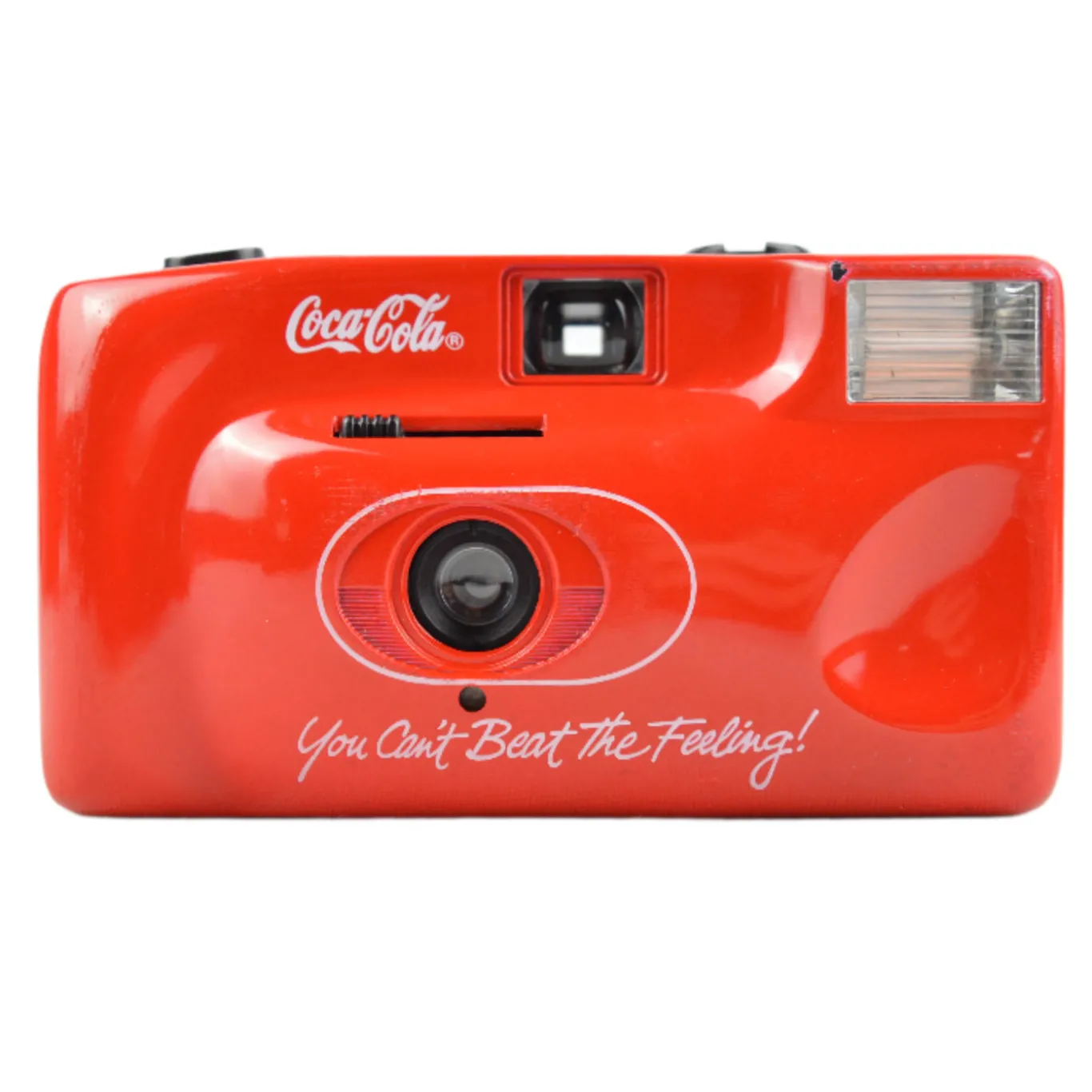 The Goldline Coca Cola point and shoot is a playful 35 mm film camera released around 1999 as a promotional piece featuring the iconic Coca Cola branding. It has a fixed focus 35 mm f/9.5 lens and a single shutter speed of approximately 1/100 s. Film is advanced and rewound manually with thumb and crank dials. A built in flash must be turned on manually and a red LED indicates readiness.