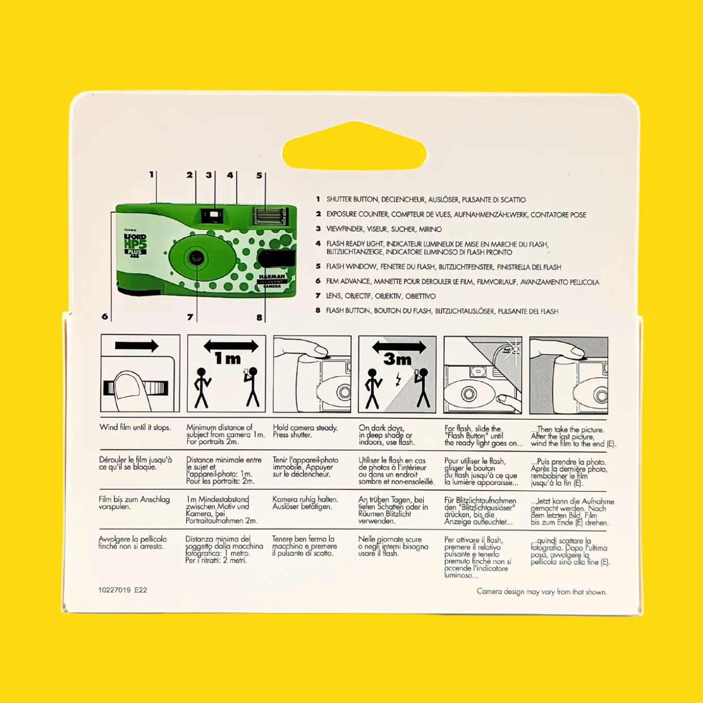 400 – 27 Exposure Single Use disposable camera features a 30 mm, f/10 lens, with a shutter speed of 1/125.
