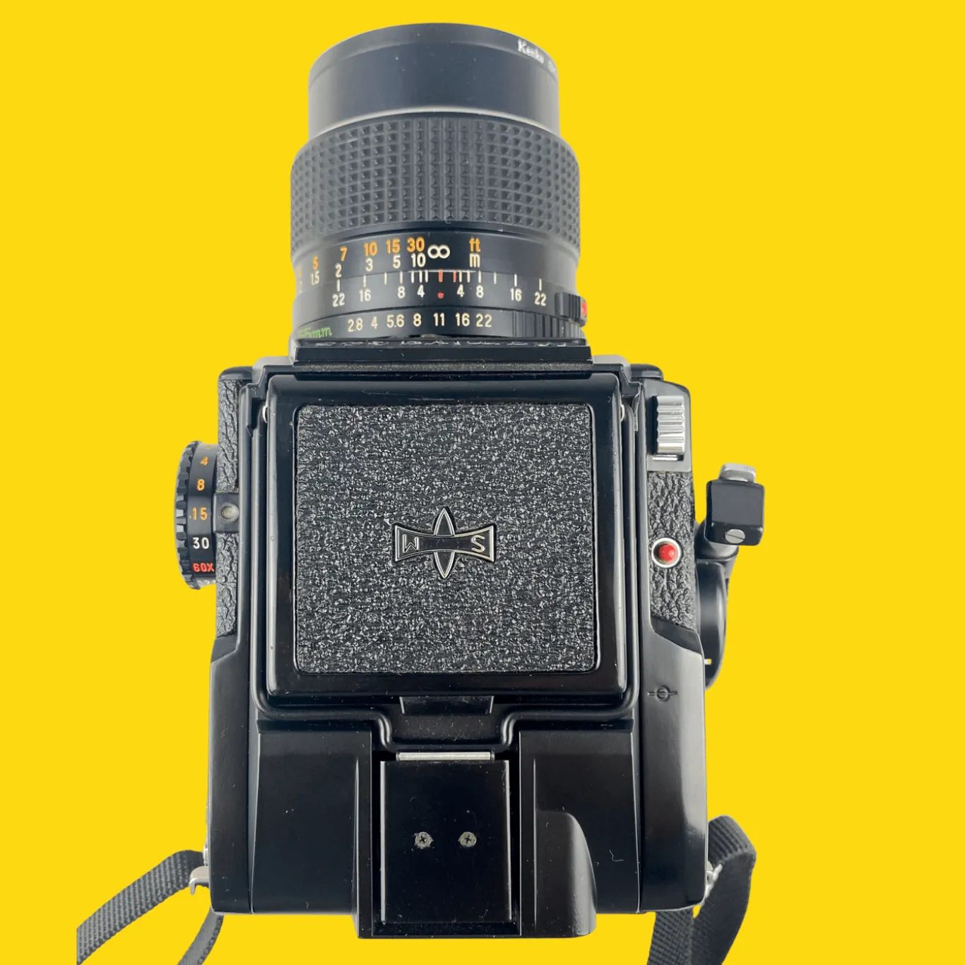 The M645 1000s features 15 6×4.5 exposures, on a standard roll of 120 film. The Camera features a modular design, allowing interchangeable viewfinders and lenses. It uses an electronically controlled cloth focal plane shutter offering speeds from Bulb to 8 seconds and 1/1000 seconds.