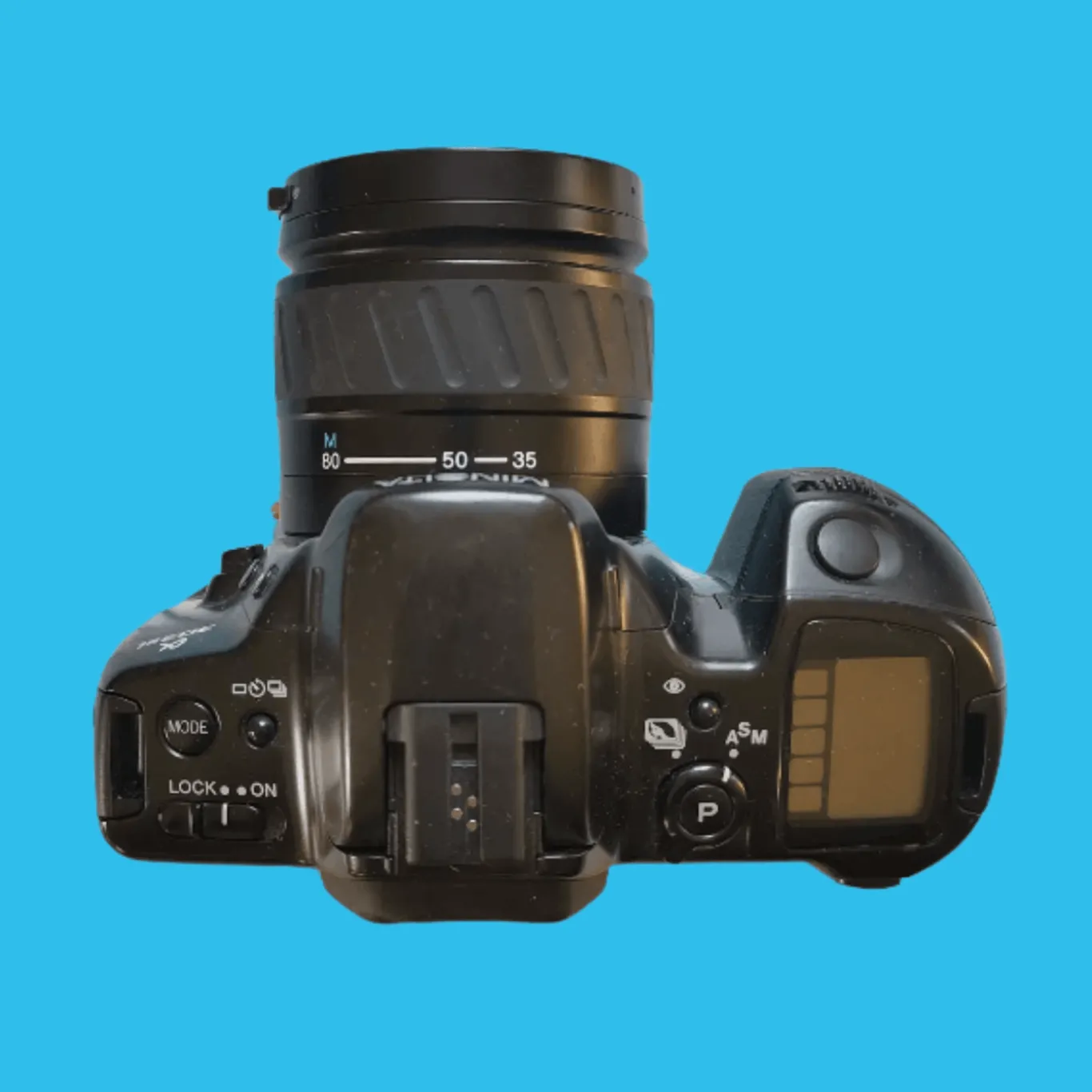 The Dynax 303si is a autofocus 35mm SLR film camera manufactured by Minolta and introduced in 1999. It is also known as the α-360si (Alpha 360si) as well as the Maxxum QTsi. This Minolta Dynax 303si has a range of auto and manual modes, as well as a wide range of creative features such as multiple exposure, spot metering, and auto bracketing. The camera is compact and lightweight, making it a great choice for photographers on the go.
