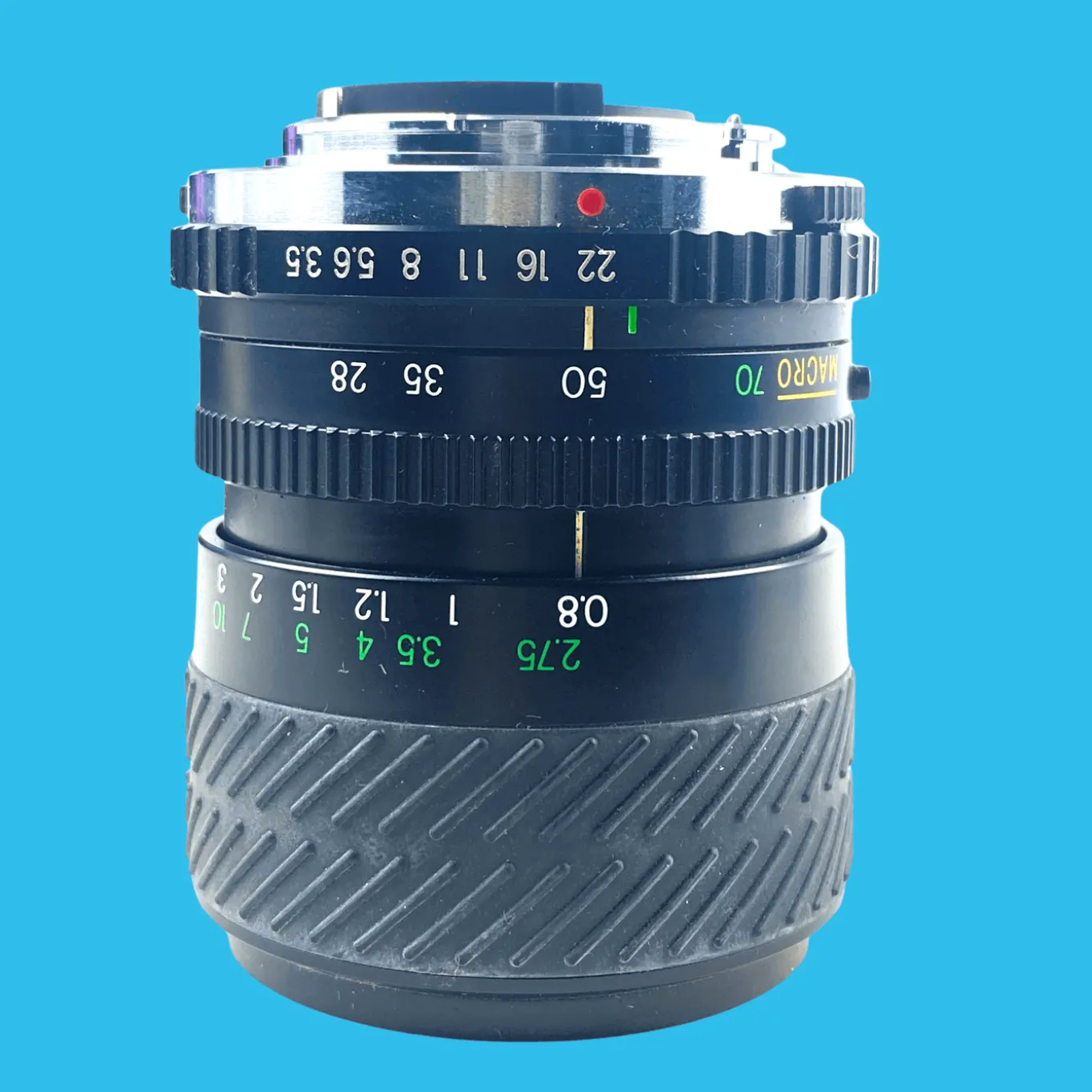 The lens elements are clear with just a few minor dust specs (no haze or fungus). The focusing operation works smoothly, plus all the apertures are selectable. This lens will fit on a Olympus OM camera with a OM mount.