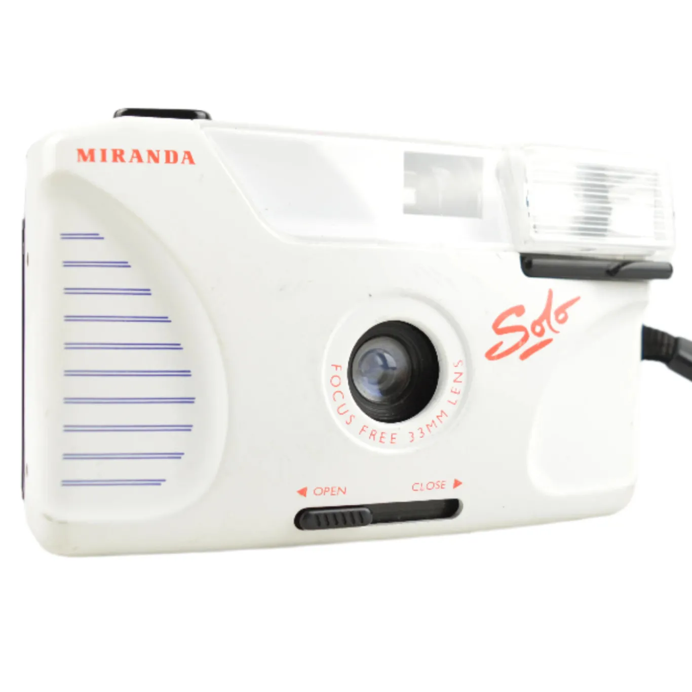 The Miranda Solo is a compact 35mm point and shoot film camera featuring a fixed focus 33mm f5.6 lens. Designed for simplicity, it uses a fixed shutter speed around 1/100 second and offers automatic exposure control, making it effortless to point and shoot in daylight. The camera advances and rewinds film manually and requires no batteries unless using an external flash.