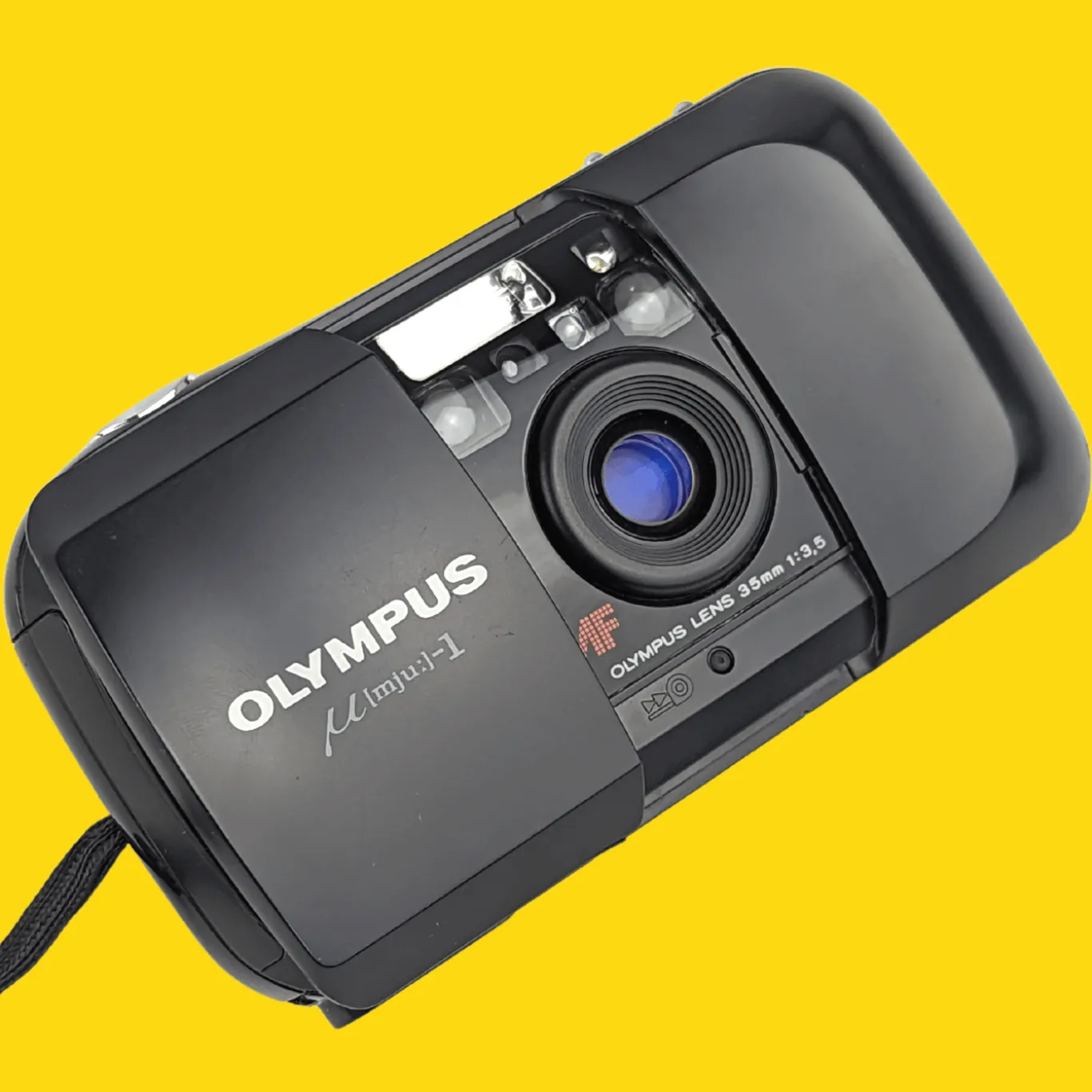 Evolved by camera designer Maitani Yoshihisa from his Olympus XA design, the µ[mju:] was very small and curvy, with an integrated lens cover. It is switched on by shifting the lens cover to one side. The original mju/Stylus was generally available in black, but a LIMITED edition model (50,000 examples) with a metallic silver finish was also released. 1992 saw the release of the Olympus µ[mju:] PANORAMA. This utilized tiny magnets to move a mask in front of the film in the middle of the roll while keeping the body and basic spec unchanged.