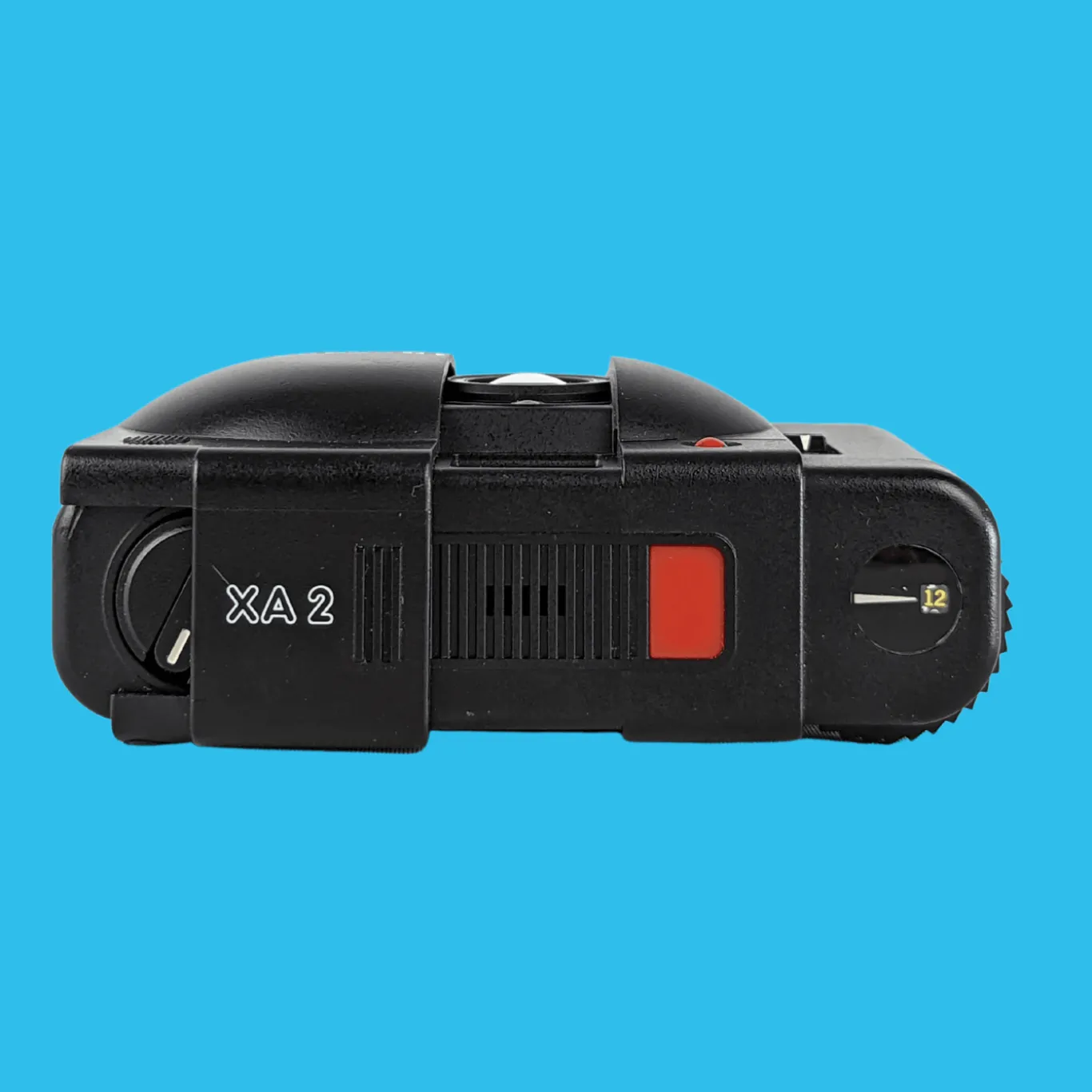 The XA2, introduced in 1980, was a simplified version of the XA with zone focusing and a programmed exposure system. The exposure meter was a CdS exposure sensor above the lens. The shutter speed range was 2 secs. to 1/750. The minimum focusing distance was 3 feet or 0.9 meters. Its film speed range was ASA 25-800.