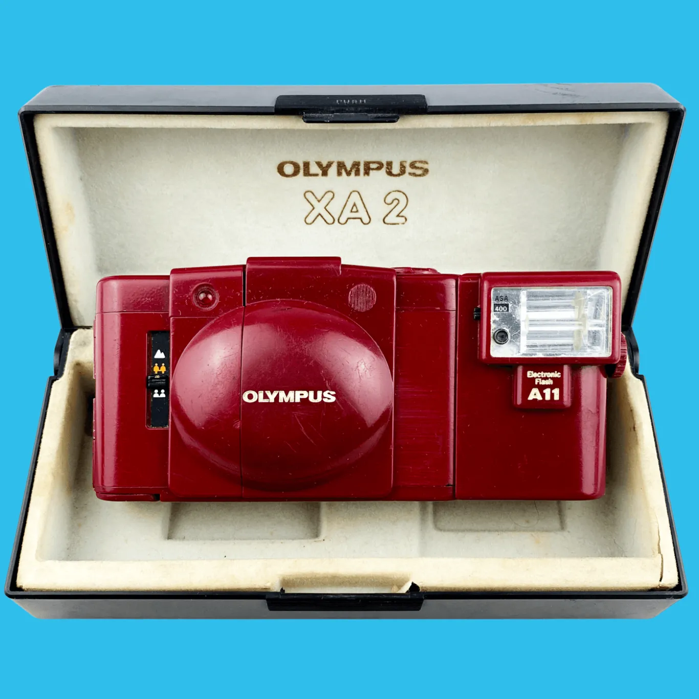 The XA2, introduced in 1980, was a simplified version of the XA with zone focusing and a programmed exposure system. The exposure meter was a CdS exposure sensor above the lens. The shutter speed range was 2 secs. to 1/750. The minimum focusing distance was 3 feet or .9 meters. Its film speed range was ASA 25-800.