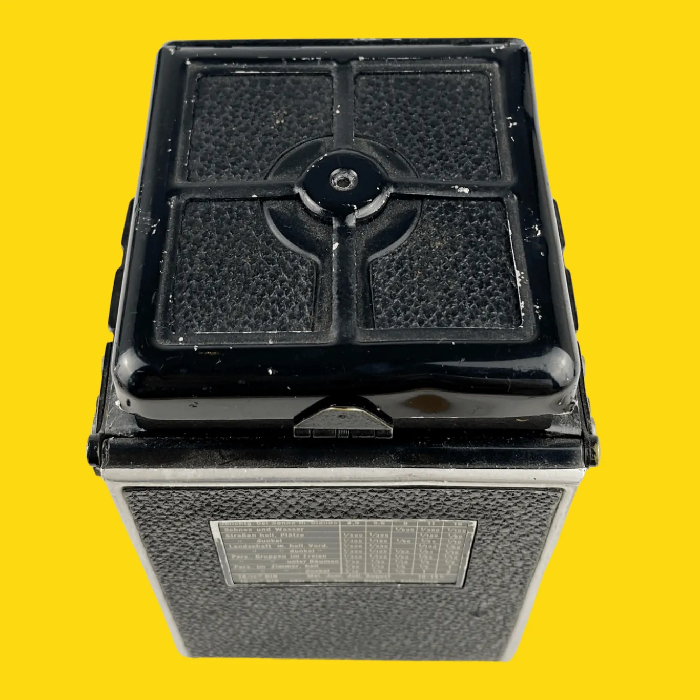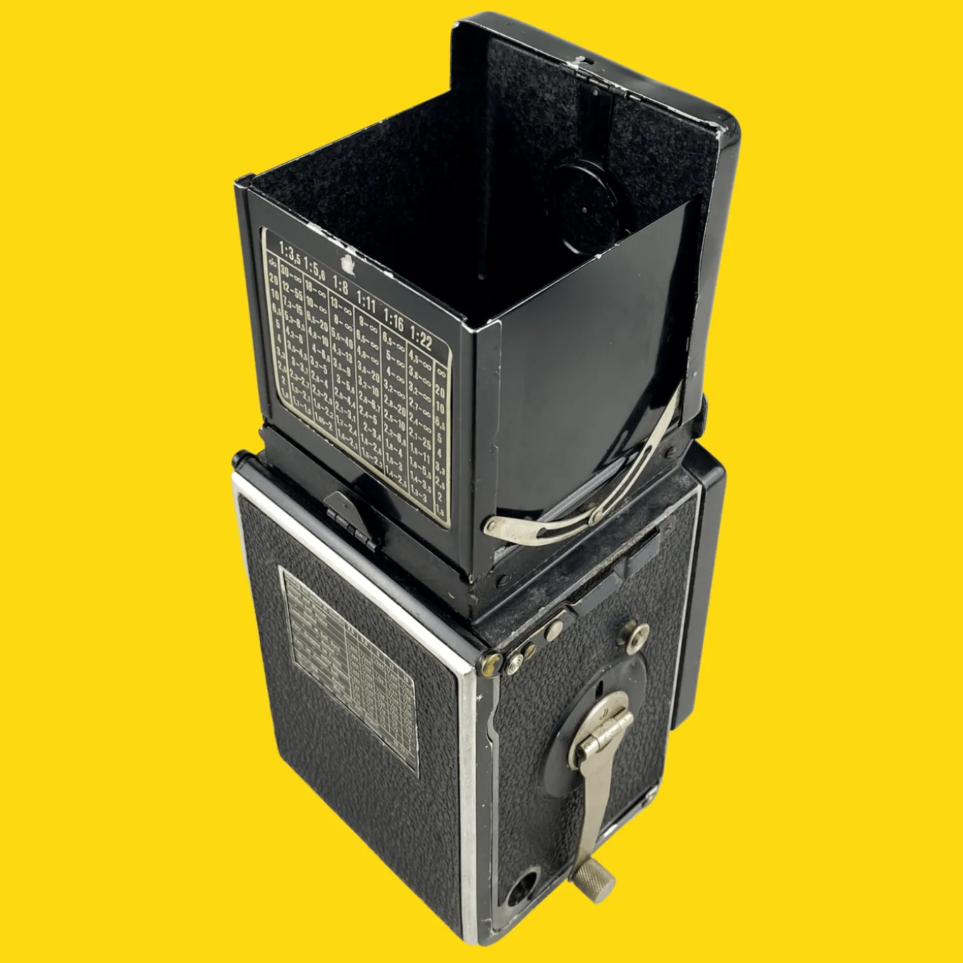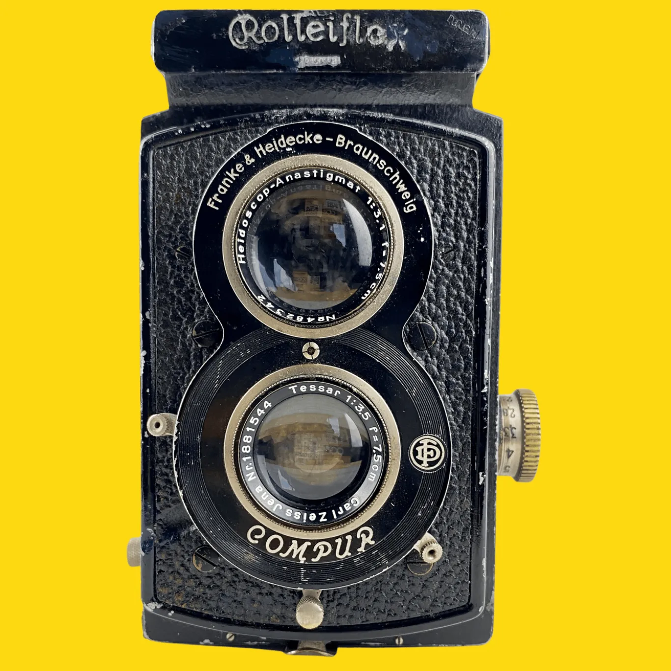 The Rollieflex Old Standard is a medium format TLR camera that produces 12 square 6X6 negatives on 120 film. A Twin Lens Reflex camera is a camera that boasts two lenses, a viewing or focusing lens and a secondary photographic lens or “taking lens.