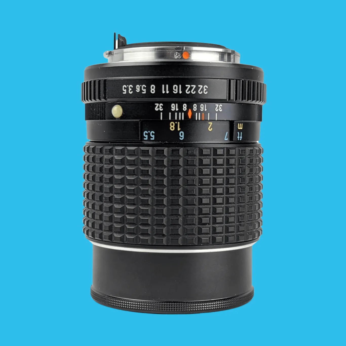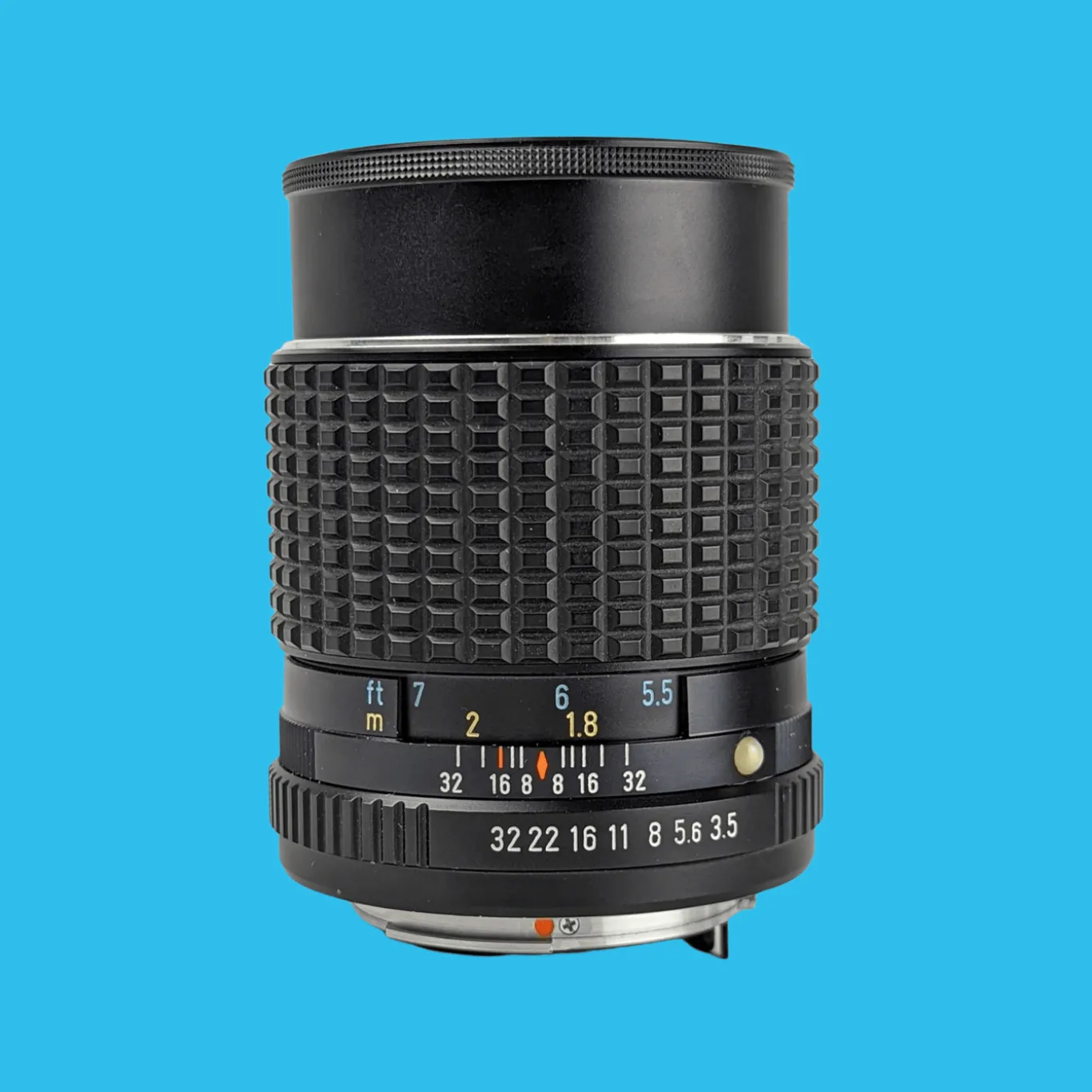 The lens elements are clear with just a few minor dust specs (no haze or fungus). The focusing operation works smoothly, plus all the apertures are selectable. This lens will fit on a Pentax SLR with a PK mount.