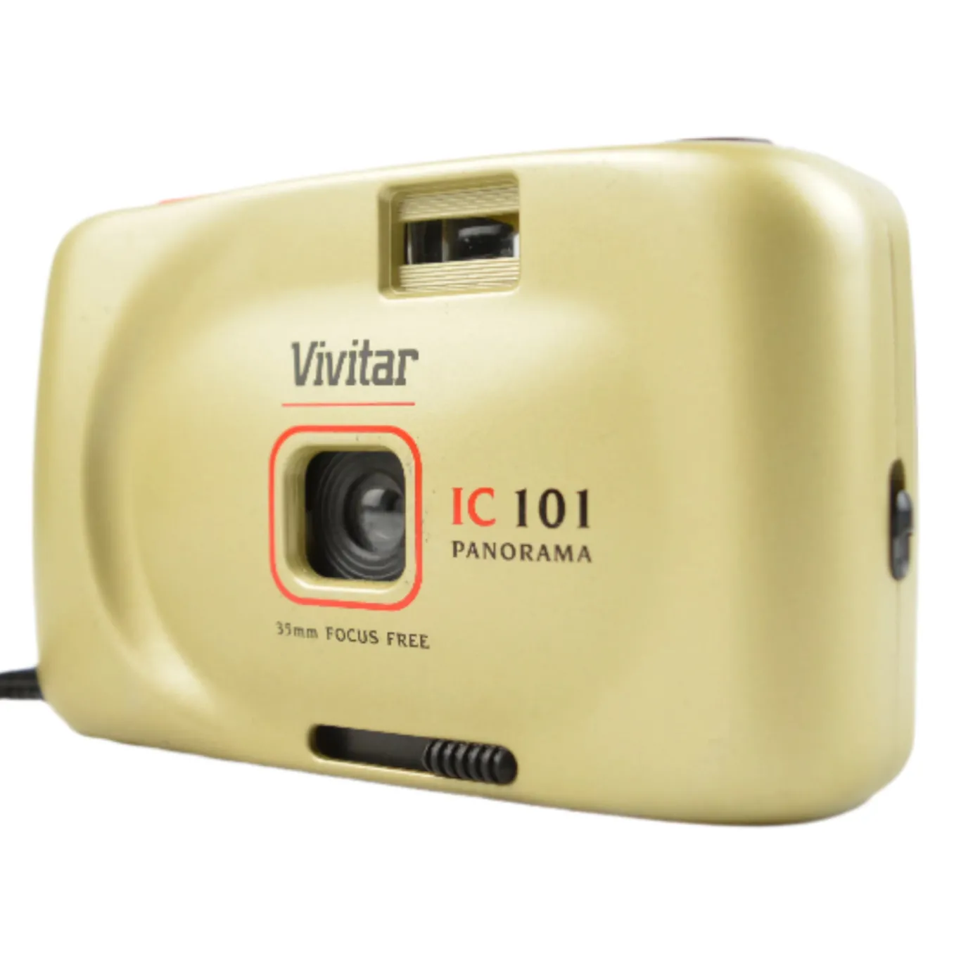 The Vivitar IC 101 Panorama is a lightweight 35mm point-and-shoot film camera designed for simplicity and portability. Released in the 1990s, it features a fixed-focus wide-angle lens and a panoramic switch that masks the film frame to create a faux panoramic effect. With no need for batteries (unless using the optional flash version), it’s fully mechanical and easy to operate
