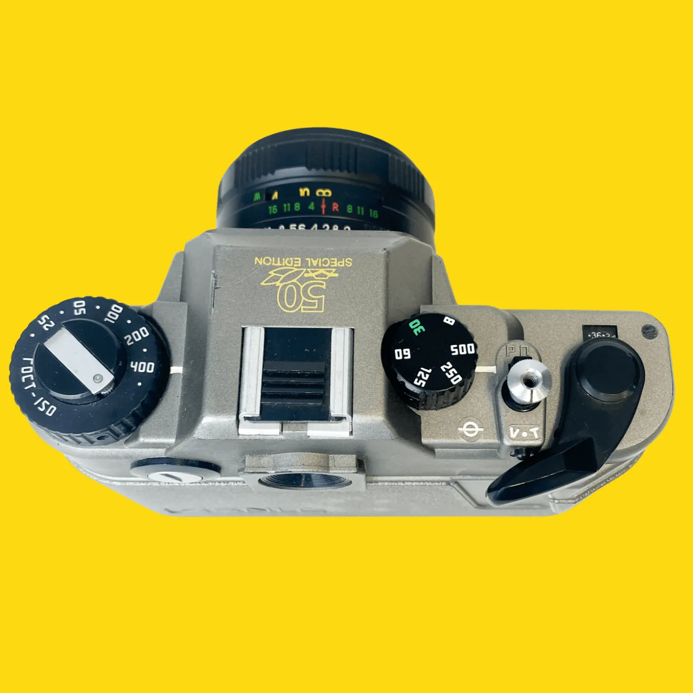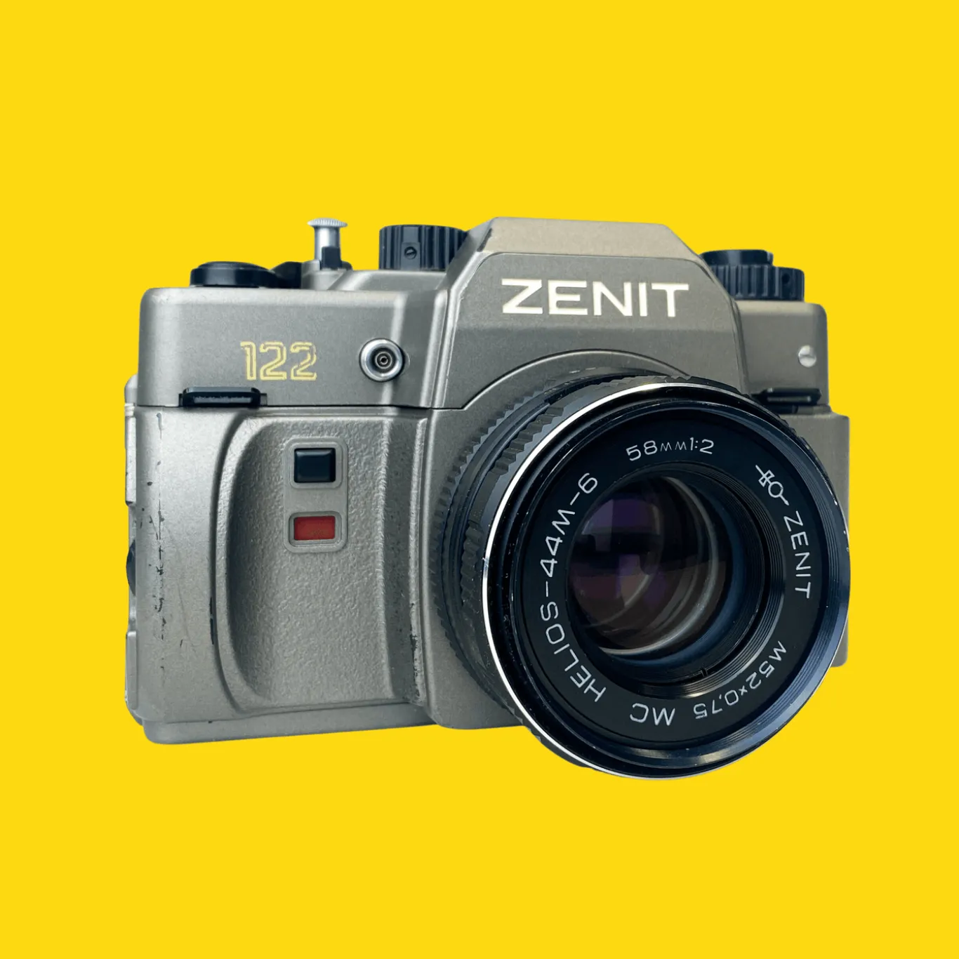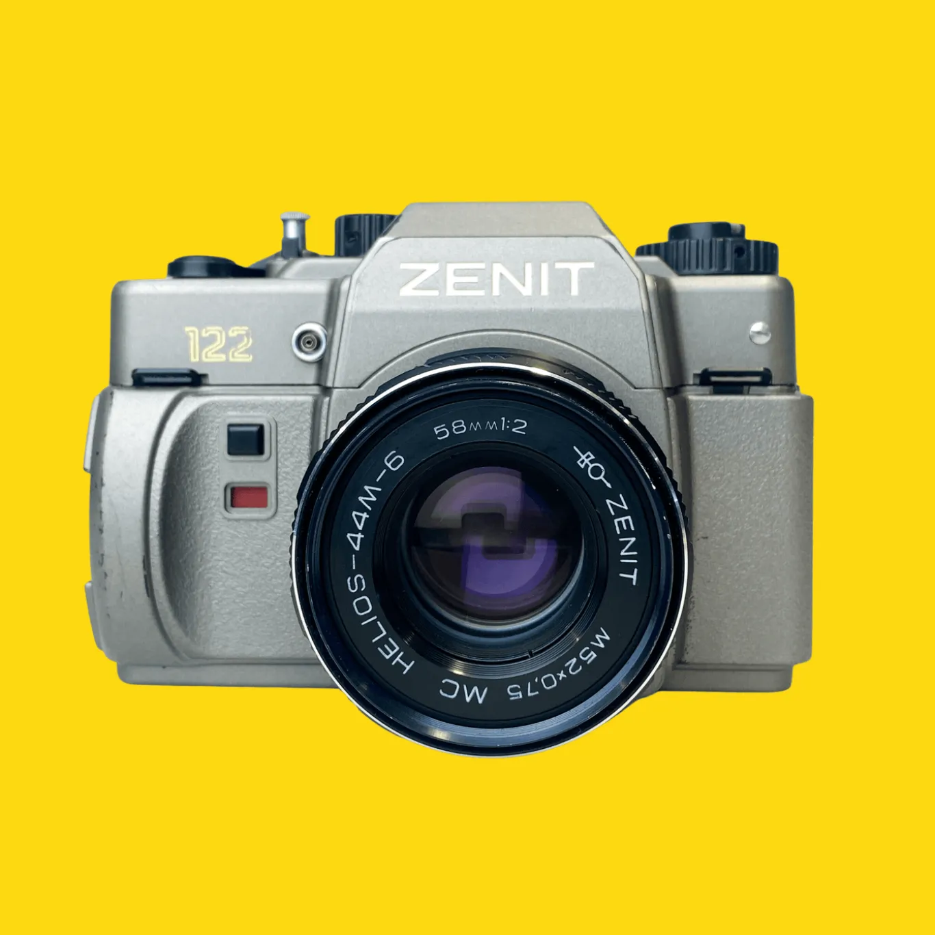 The Zenit-122 Anniversary edition was produced to commemorate Kmz’s 50th anniversary, and a special edition of the Zenit-122 camera was produced in 1992. The camera comes in titanium grey ABS plastic with gold silkscreened inscriptions. Even serial numbers have special markings as the camera bottom is signed “Made in Russia”.
